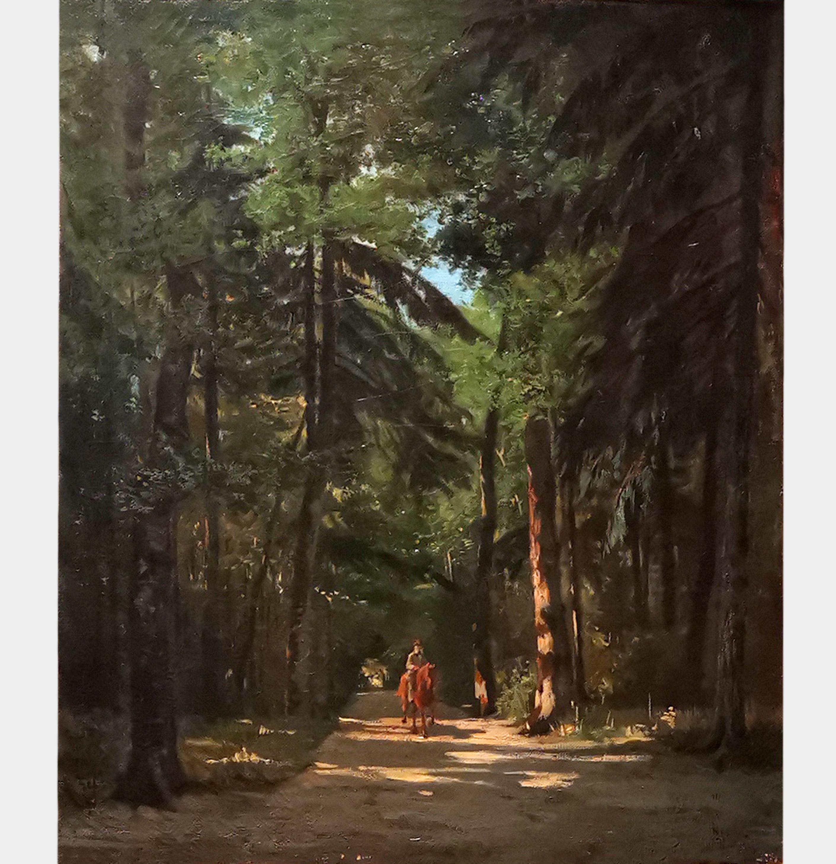 Cavalcade dans la forêt, huile sur toile, monogrammée A.de M. et datée 95, 56x46 cm