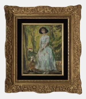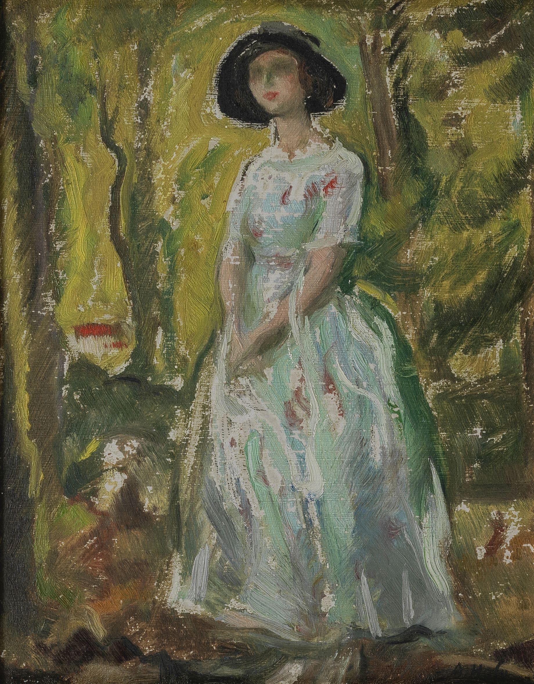Portrait d'élégante au chapeau, huile sur panneau, signée, 23x18 cm