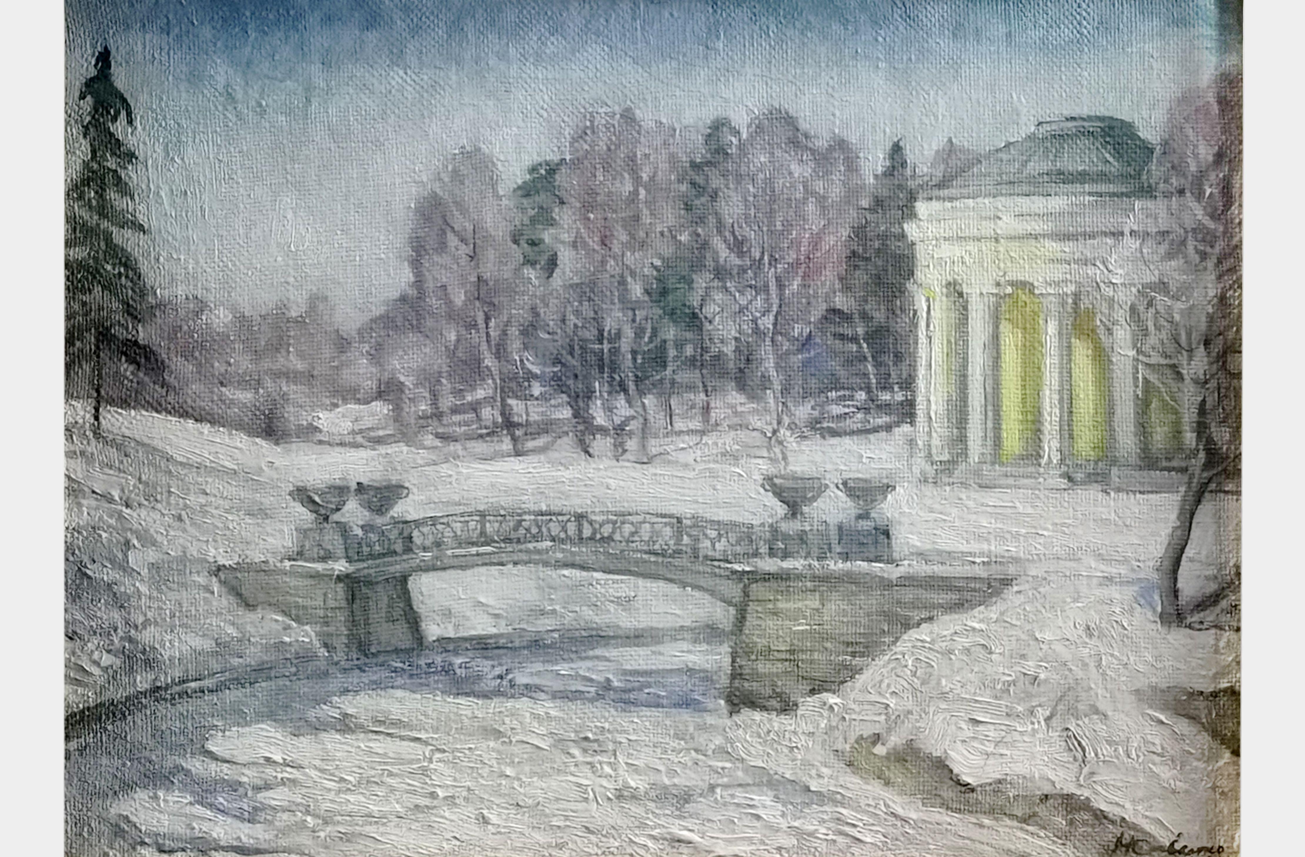 Scène d'hiver, park Pavlosk avec pavillon, huile sur toile, signée Savenko et datée 2001, 30x40 cm