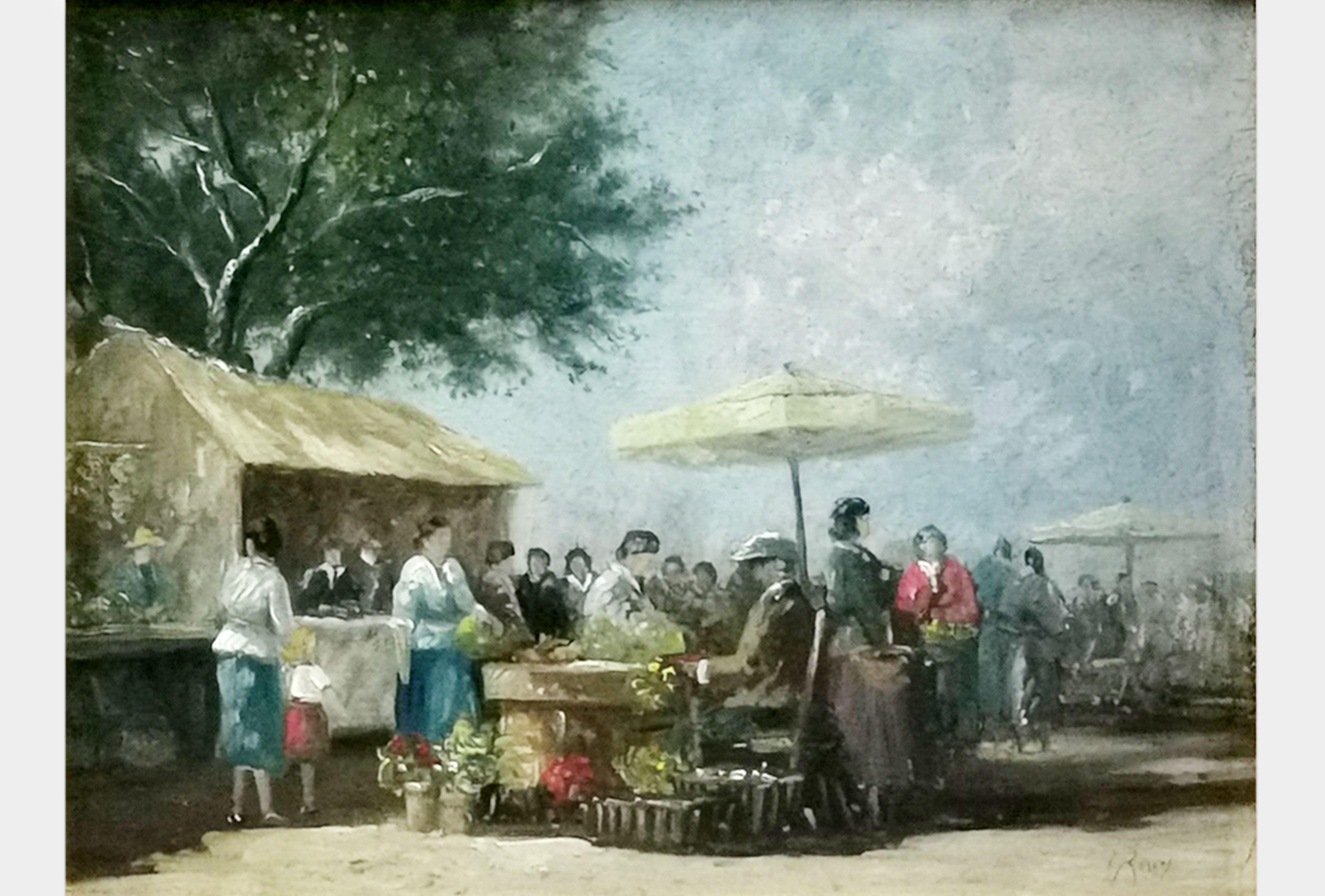 Scène du marché, huile sur panneau, signée L.Roux, 19x23 cm