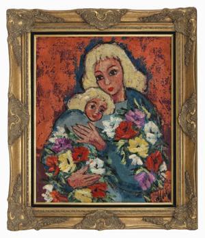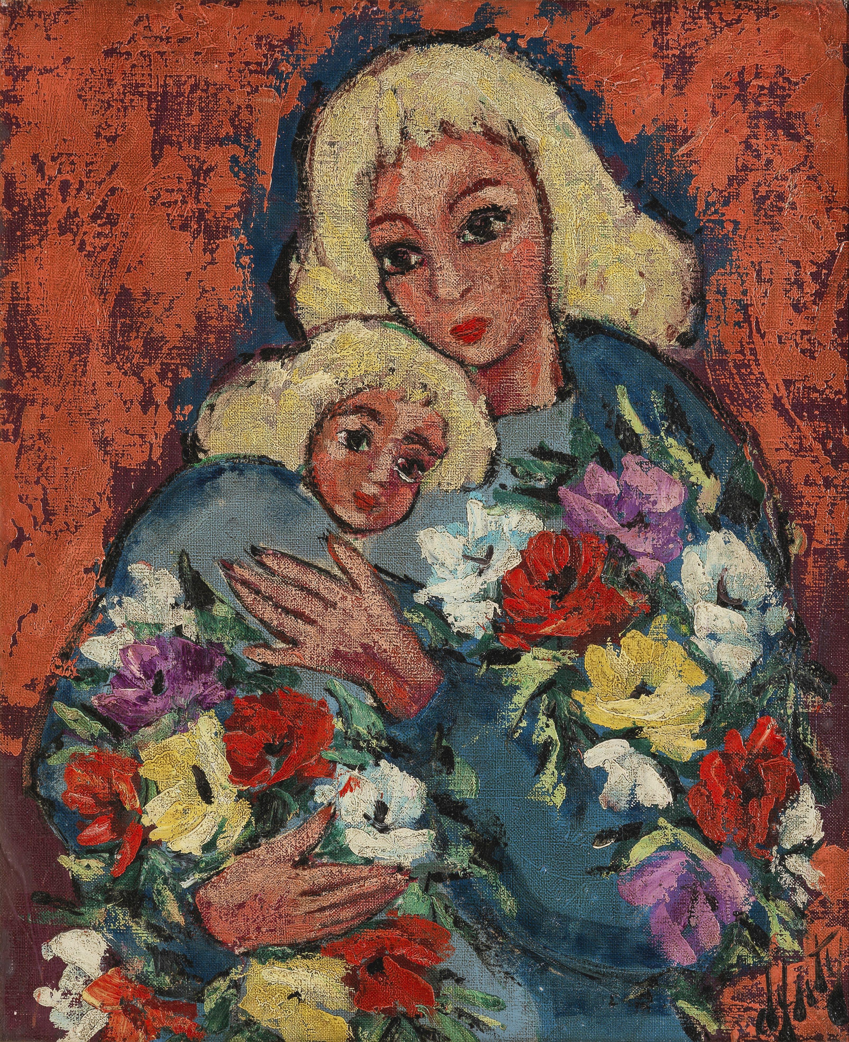 Maternité, huile sur toile, signée, cachet de l'atelier au dos, 65x54 cm