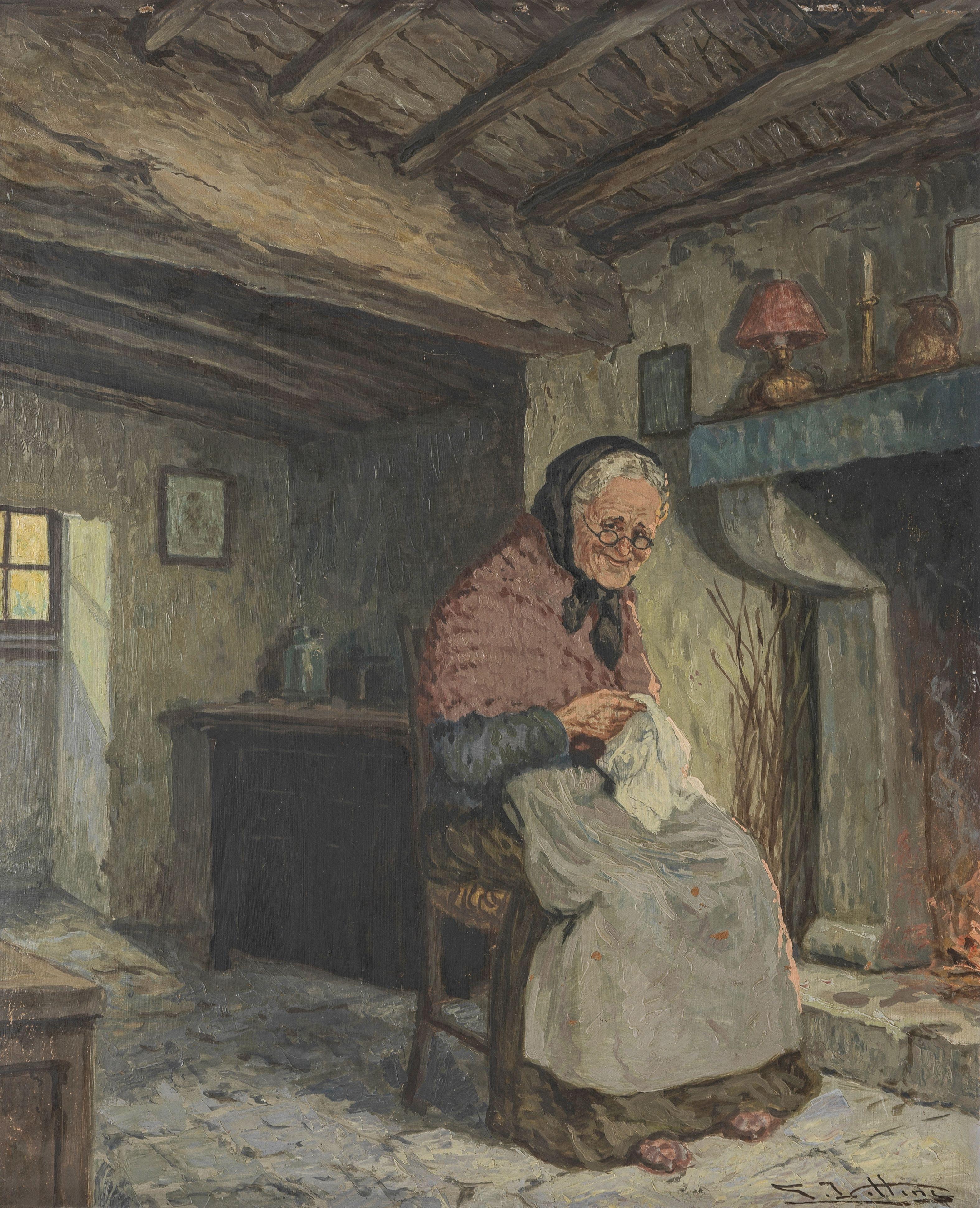 Grand-mère brodant près de la cheminée, huile sur panneau, signature illisible, 56x46 cm