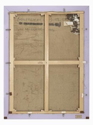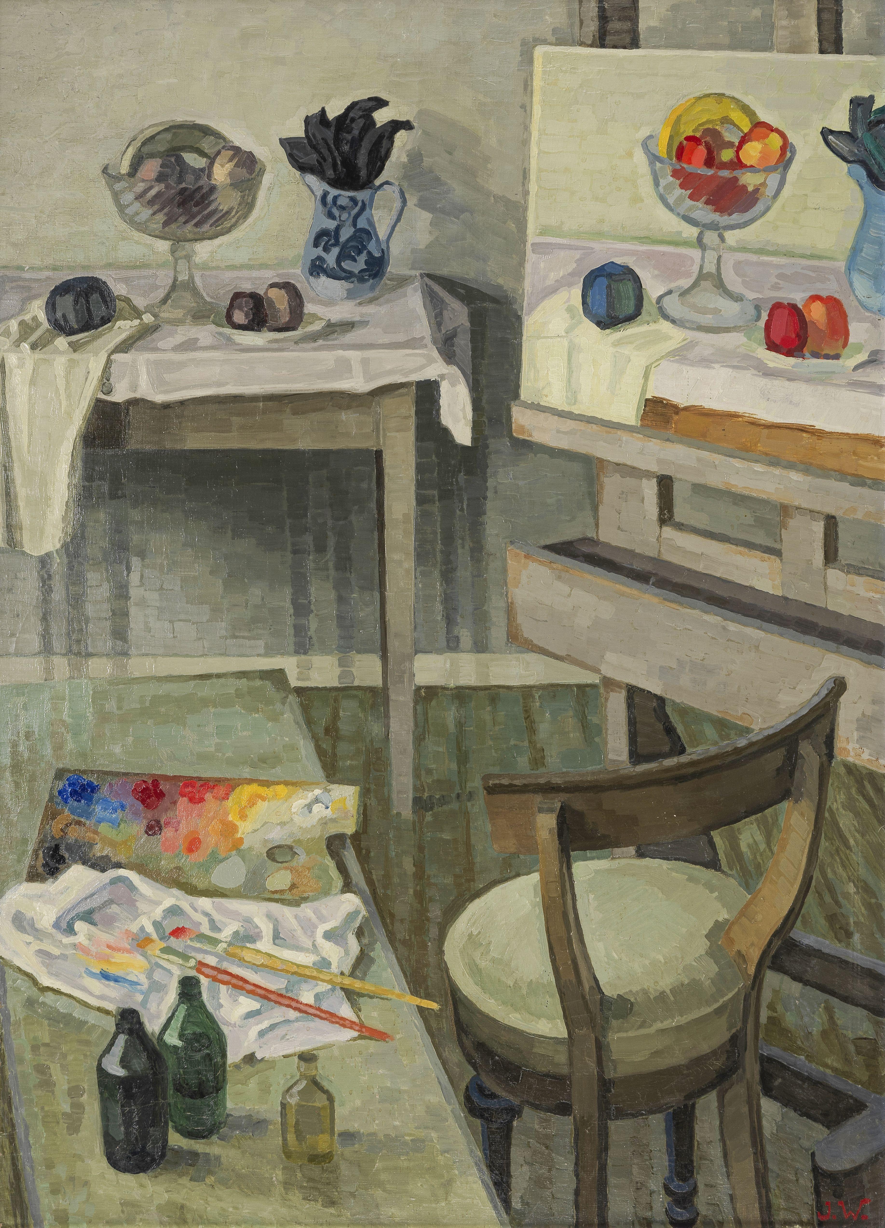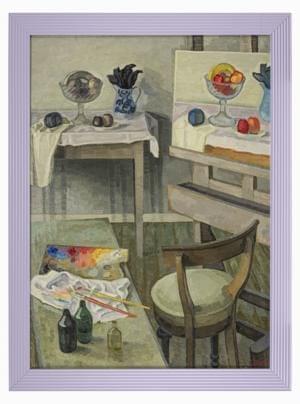 Atelier de peintre, huile sur toile, monogrammée, signée au dos, datée 1986 au dos, 110x81 cm