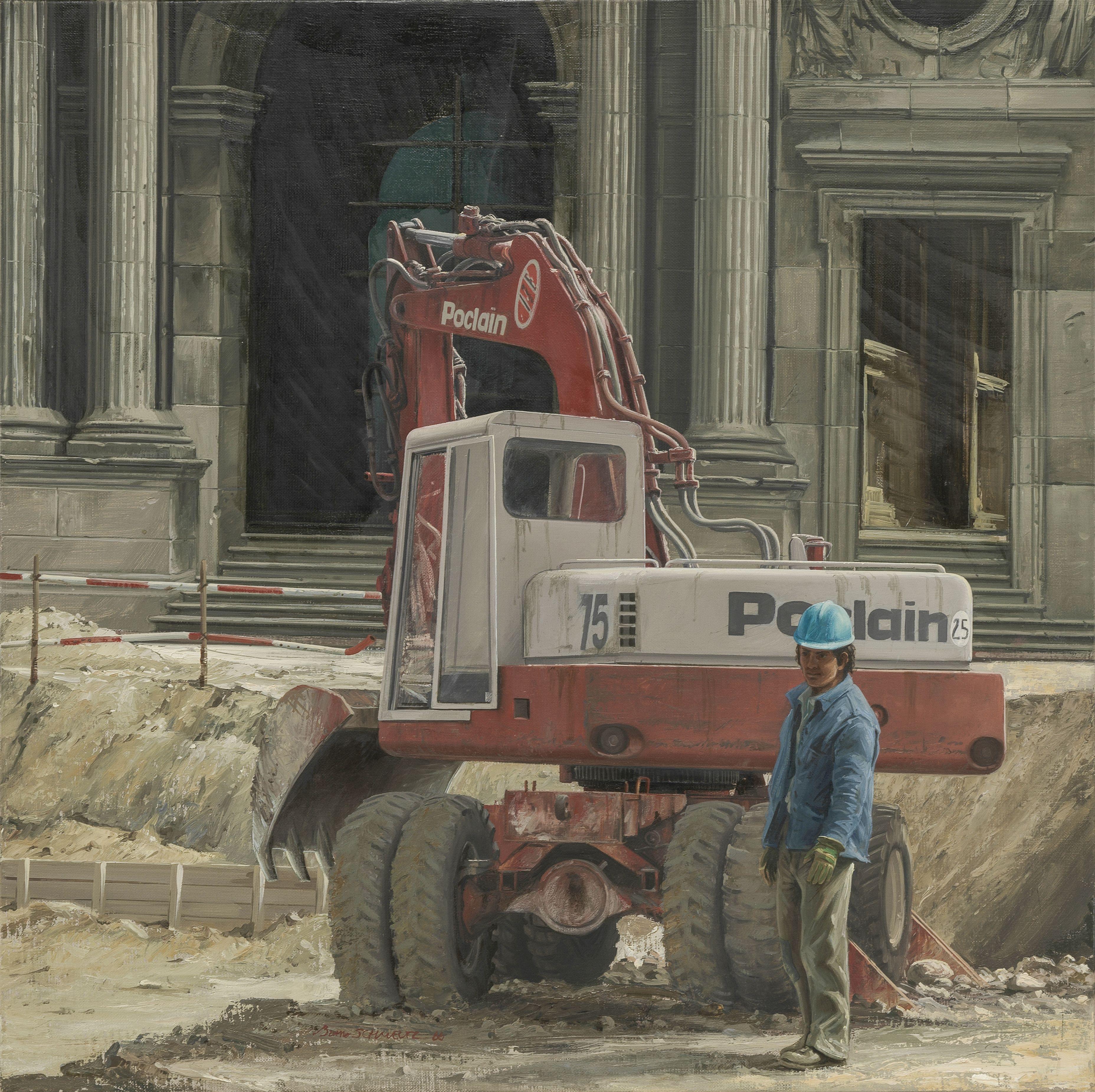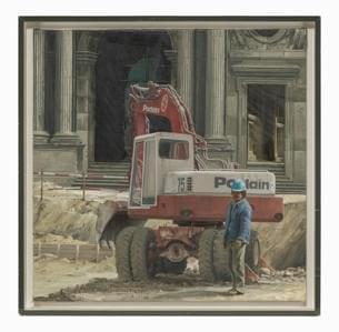 Le chantier du Louvre, huile sur toile, signée et datée 1988, 54x54 cm