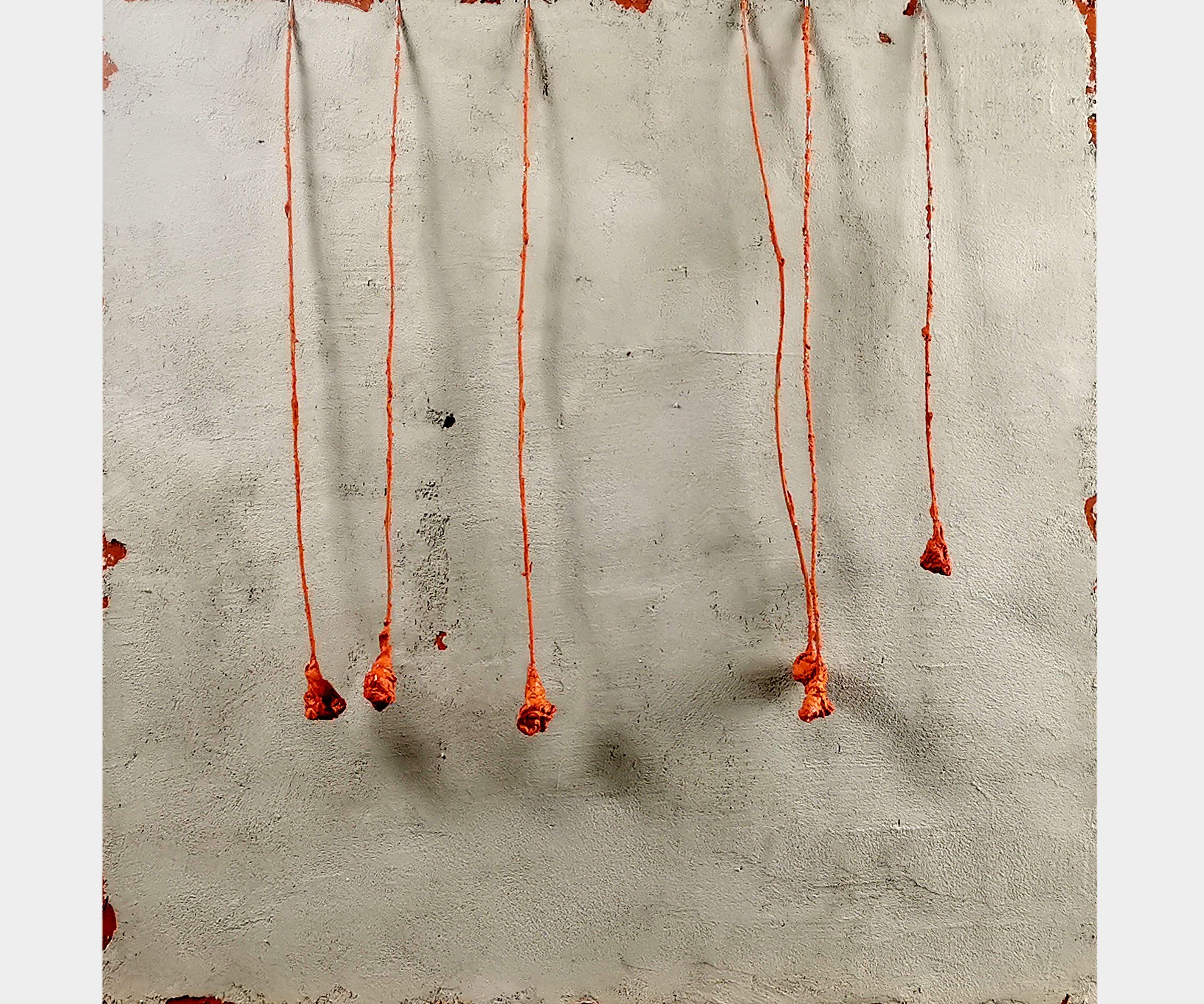 Sans titre, fils oranges sur fond blanc, technique mixte, 57x57 cm. Provenance: collection privée genevoise