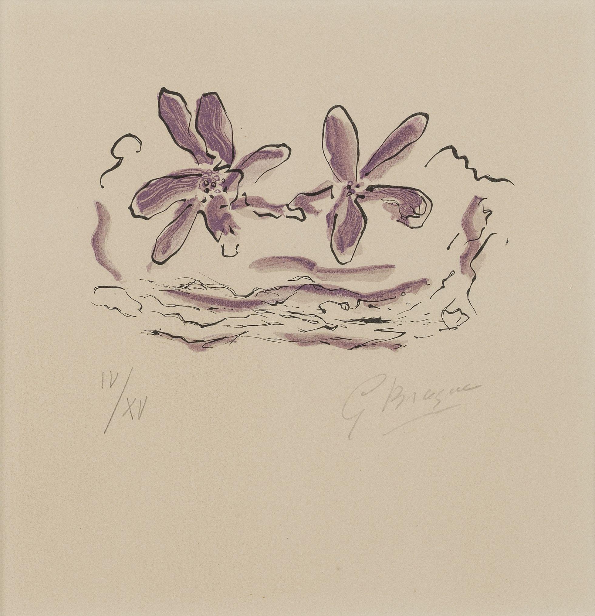 Deux fleurs violettes, "Lettera amorosa", lithographie, numérotée IV/XV et signée à la mine de plomb, 24x23 cm