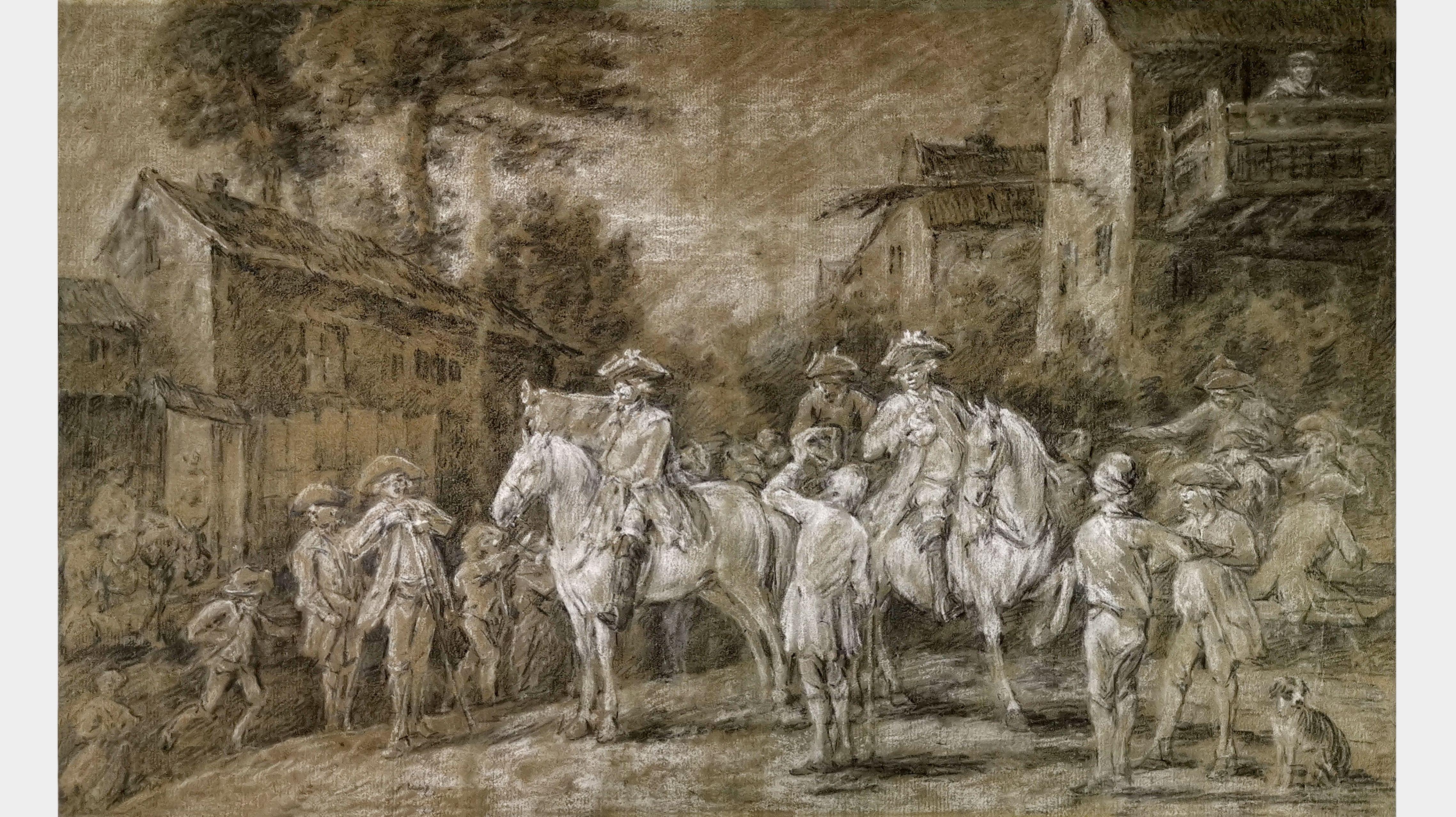 Départ de la chasse, fusain, craie blanche sur papier, 30x49 cm