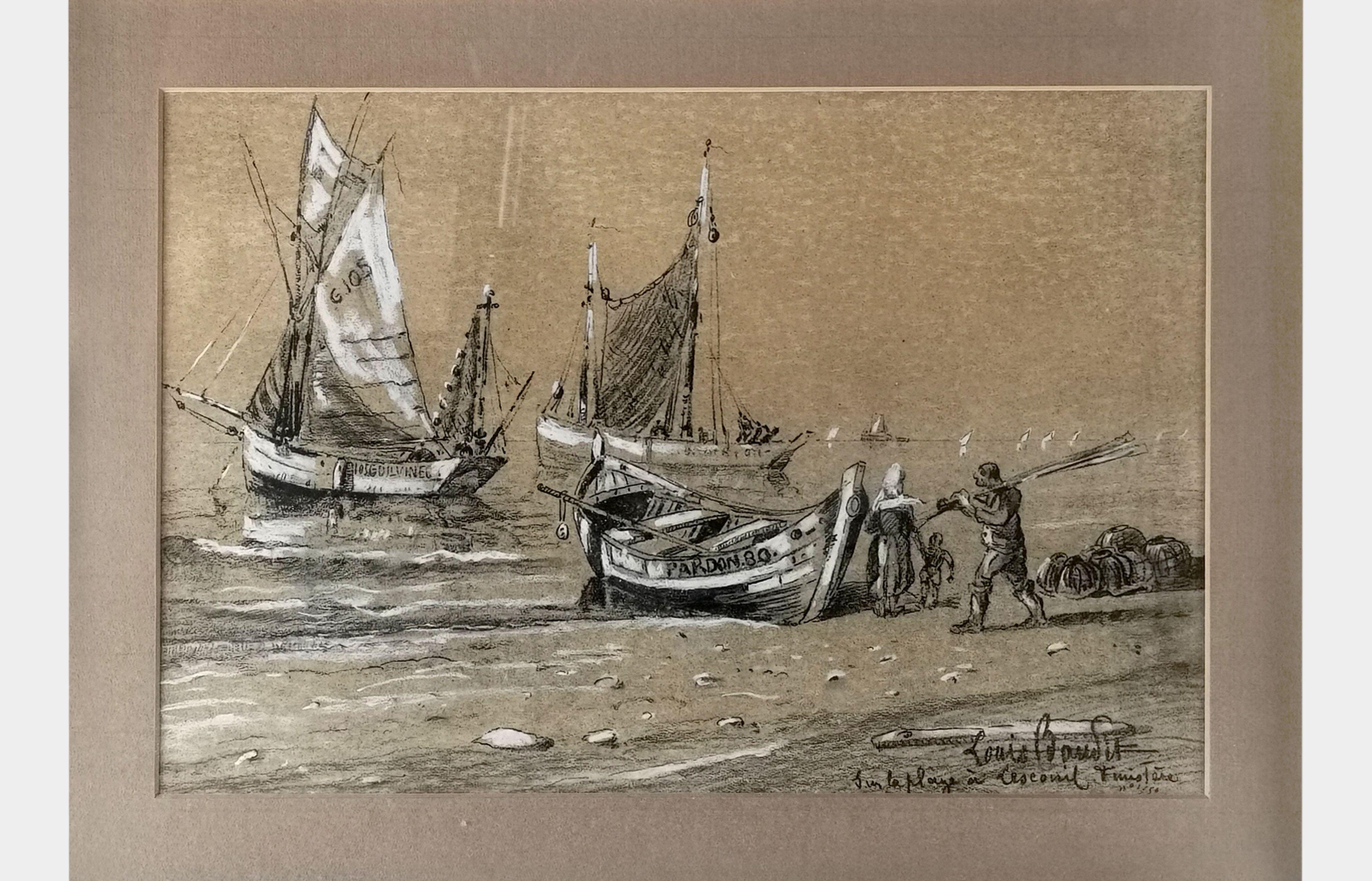 Sur la plage à Lesconil, Finistère, fusain et gouache sur papier, signé, daté au dos 1935, 32x45 cm