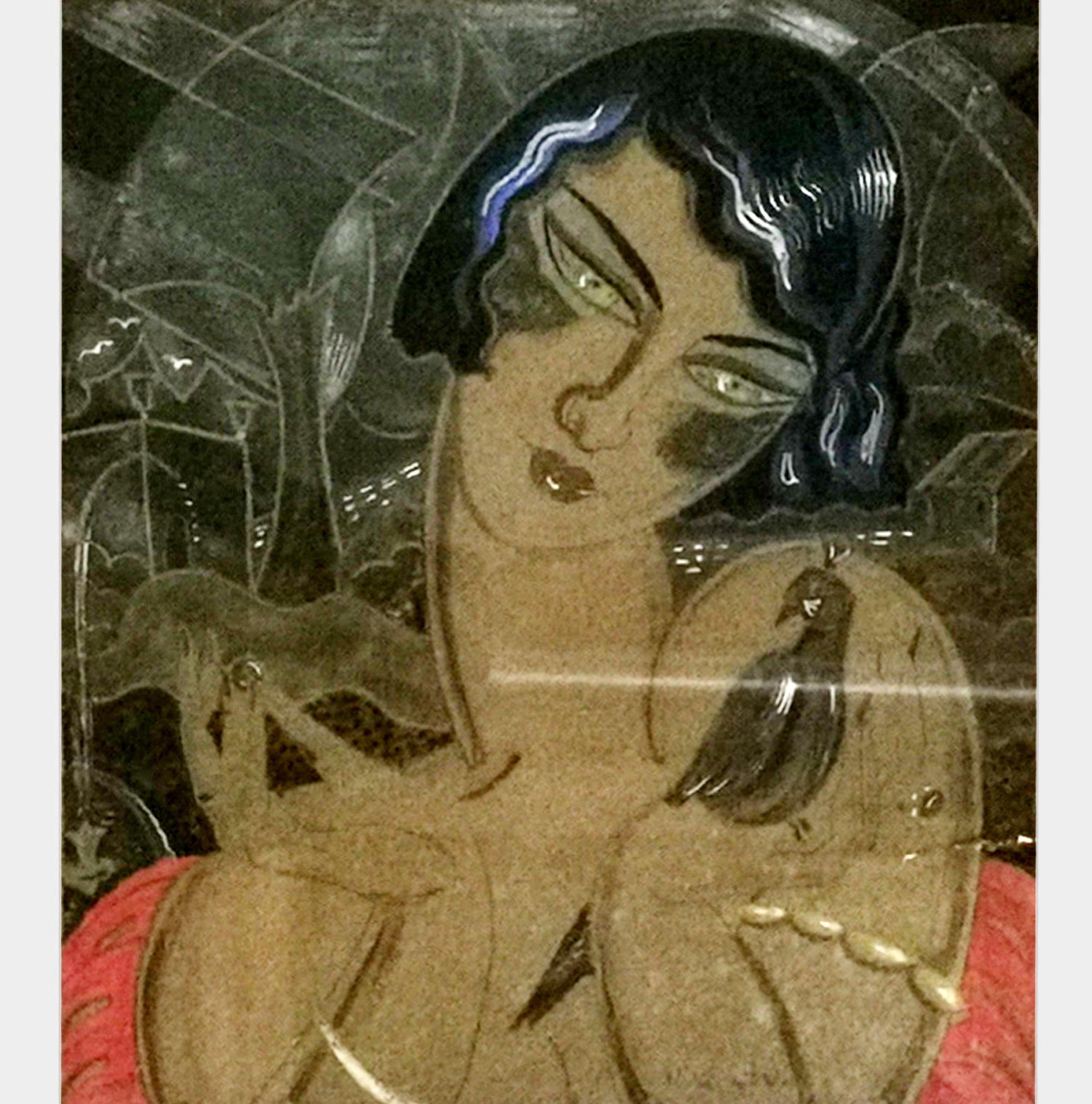 Femme à l'oiseau, gouache sur papier, 23x20 cm