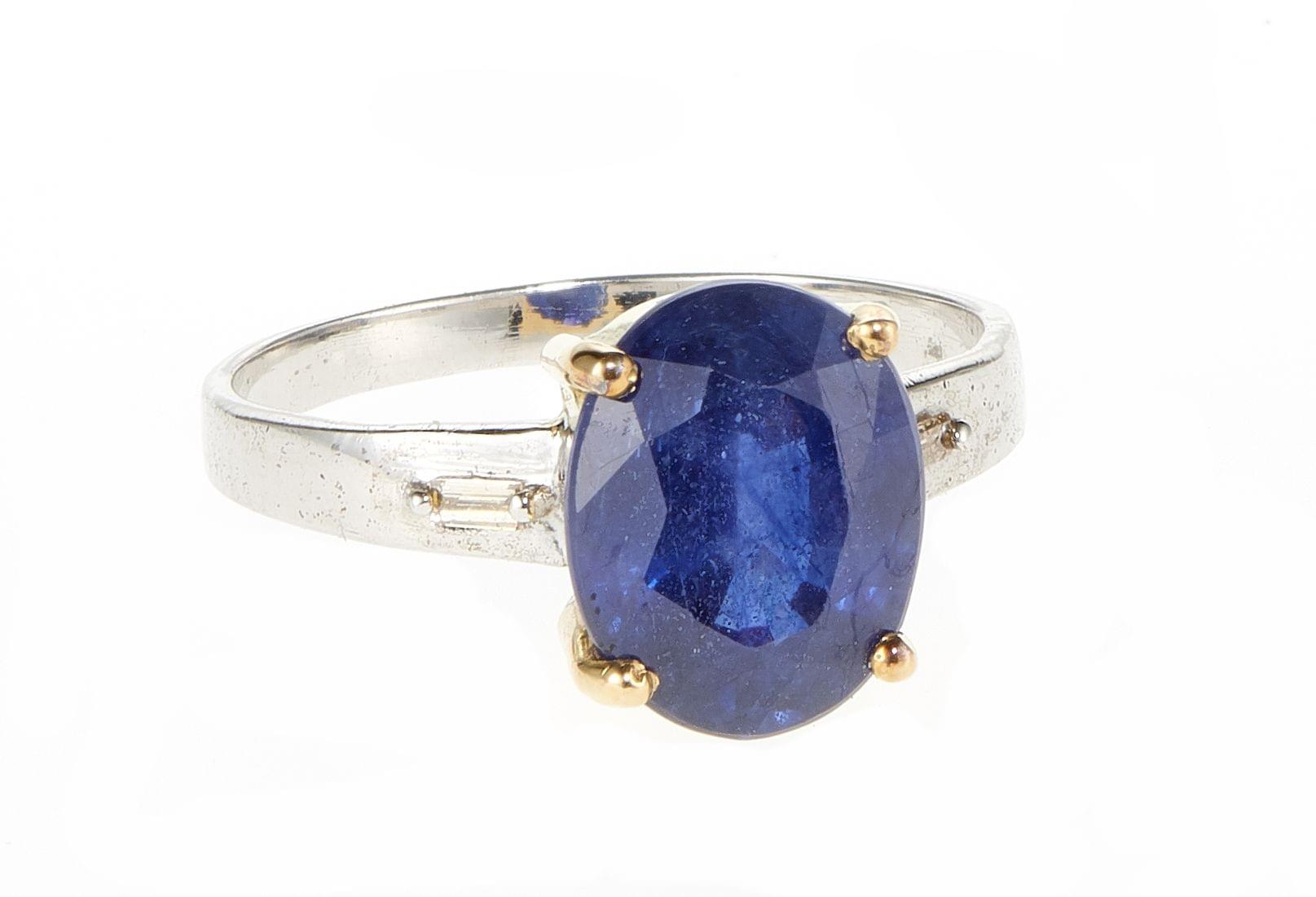 4248. 6261 -*Bague sertie d'un saphir taille ovale (env. 3,8 ct) épaulé de diamants taille baguette