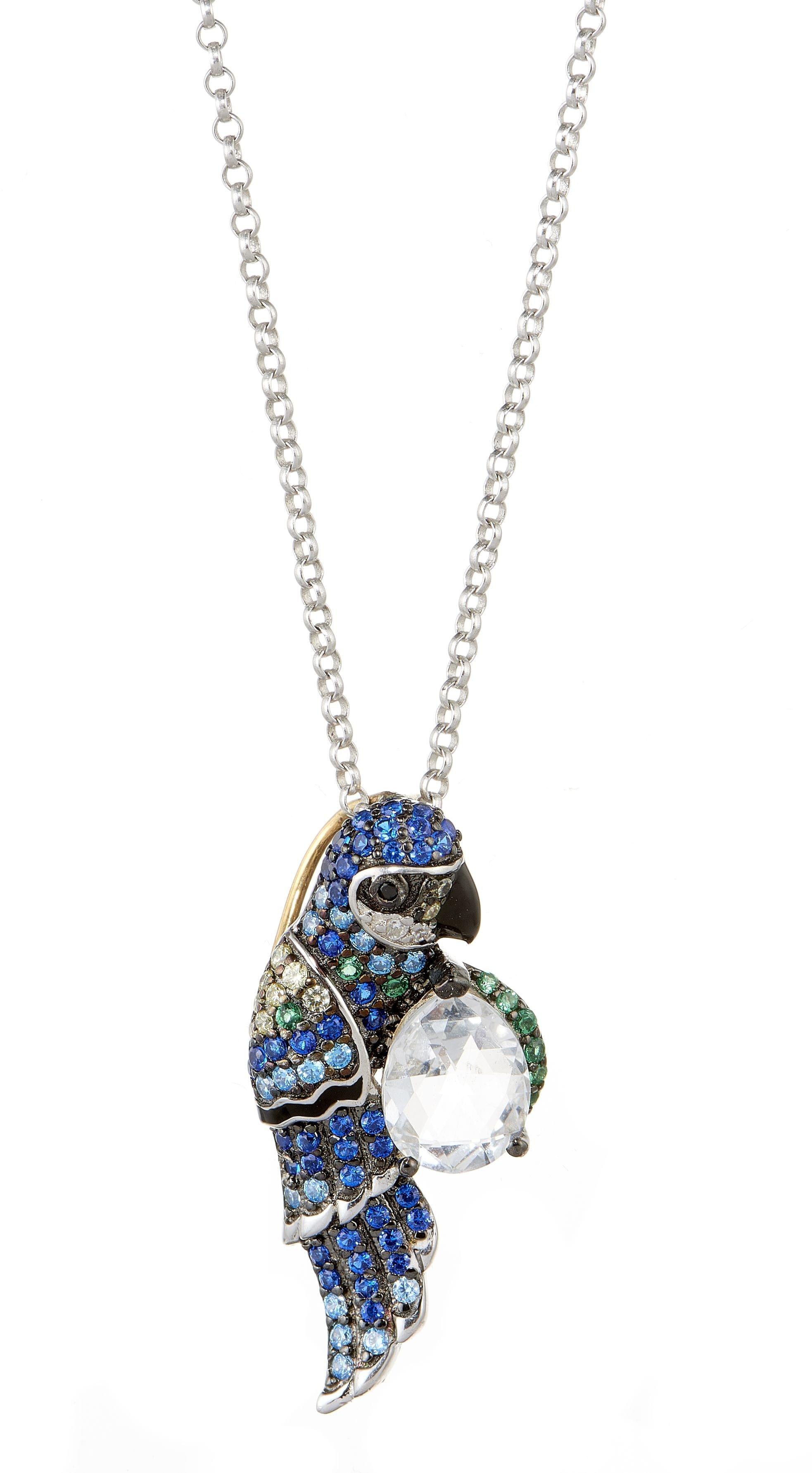 4159. 6623 -*Collier à motif de perroquet émaillé retenant une topaze incolore taille poire facettée et pavé de pierres d'imitation multicolores