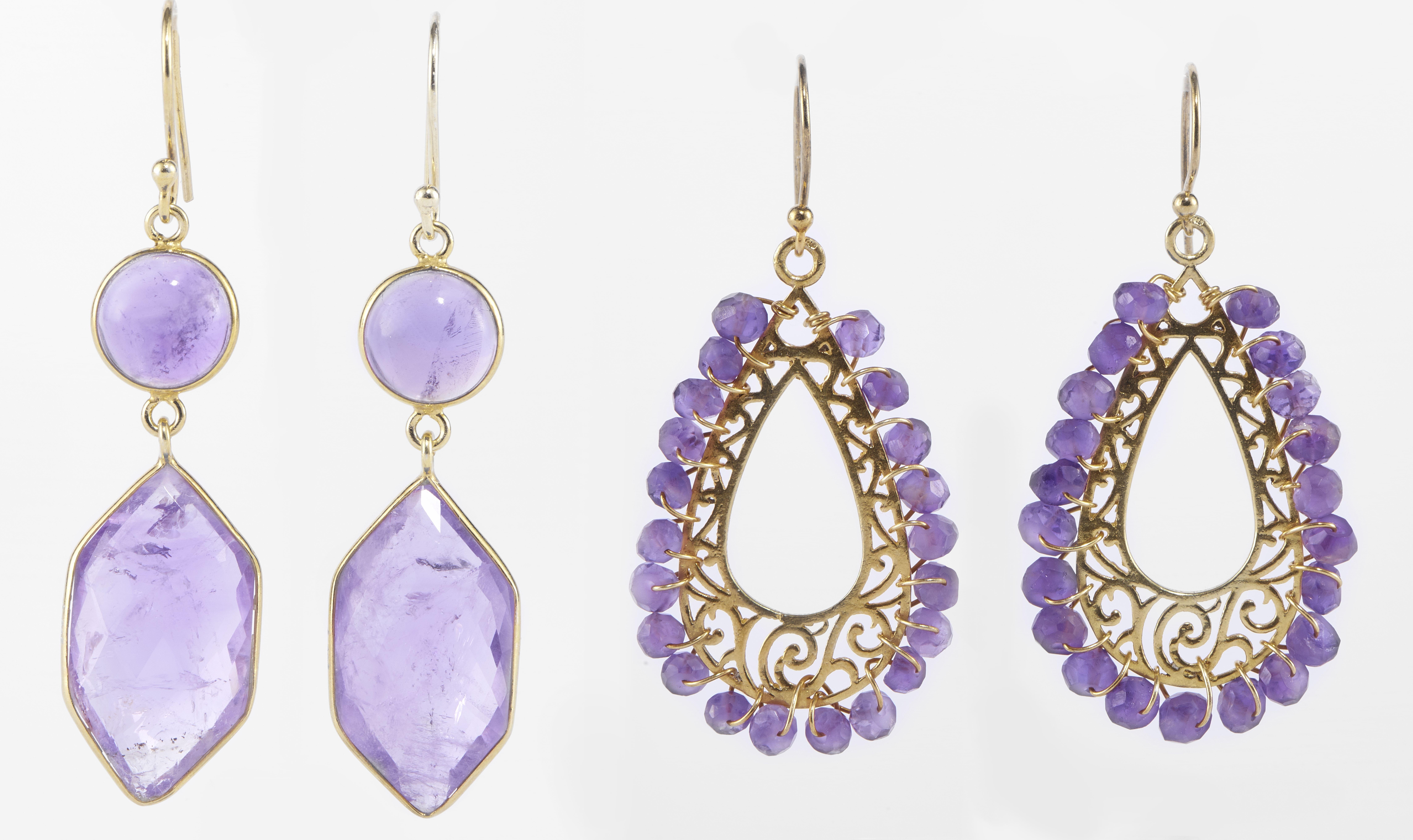 3130. 7731/7732*Lot de deux paires de boucles d'oreilles, l'une à motifs ajourés entourés de petites améthystes facettées, l'autre retenant des améthystes taille fantaisie facettées rehaussées d'améthystes taille cabochon ronde