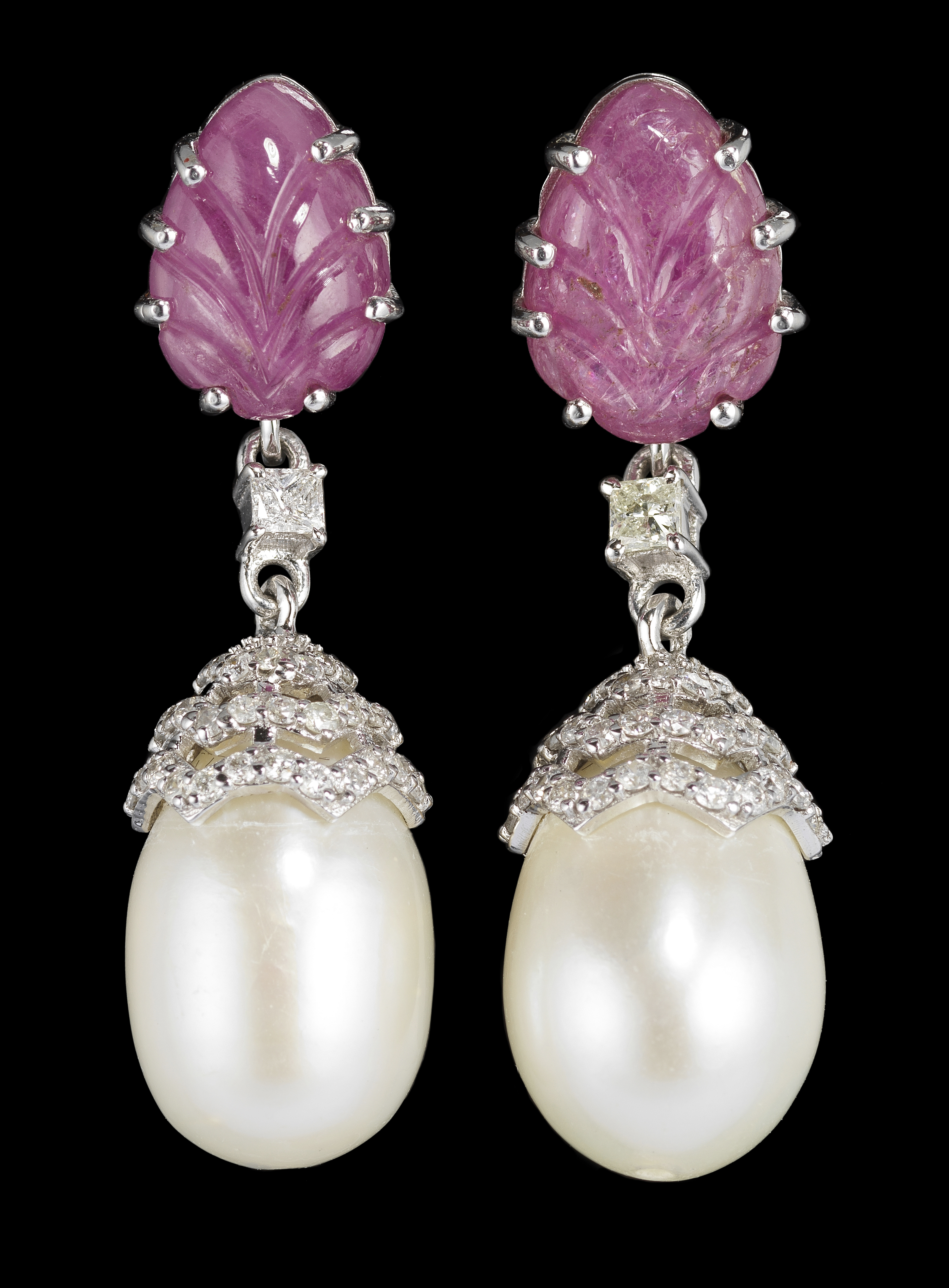 4388. *Pendants d'oreilles sertis chacun d'un rubis sculpté à motif de...