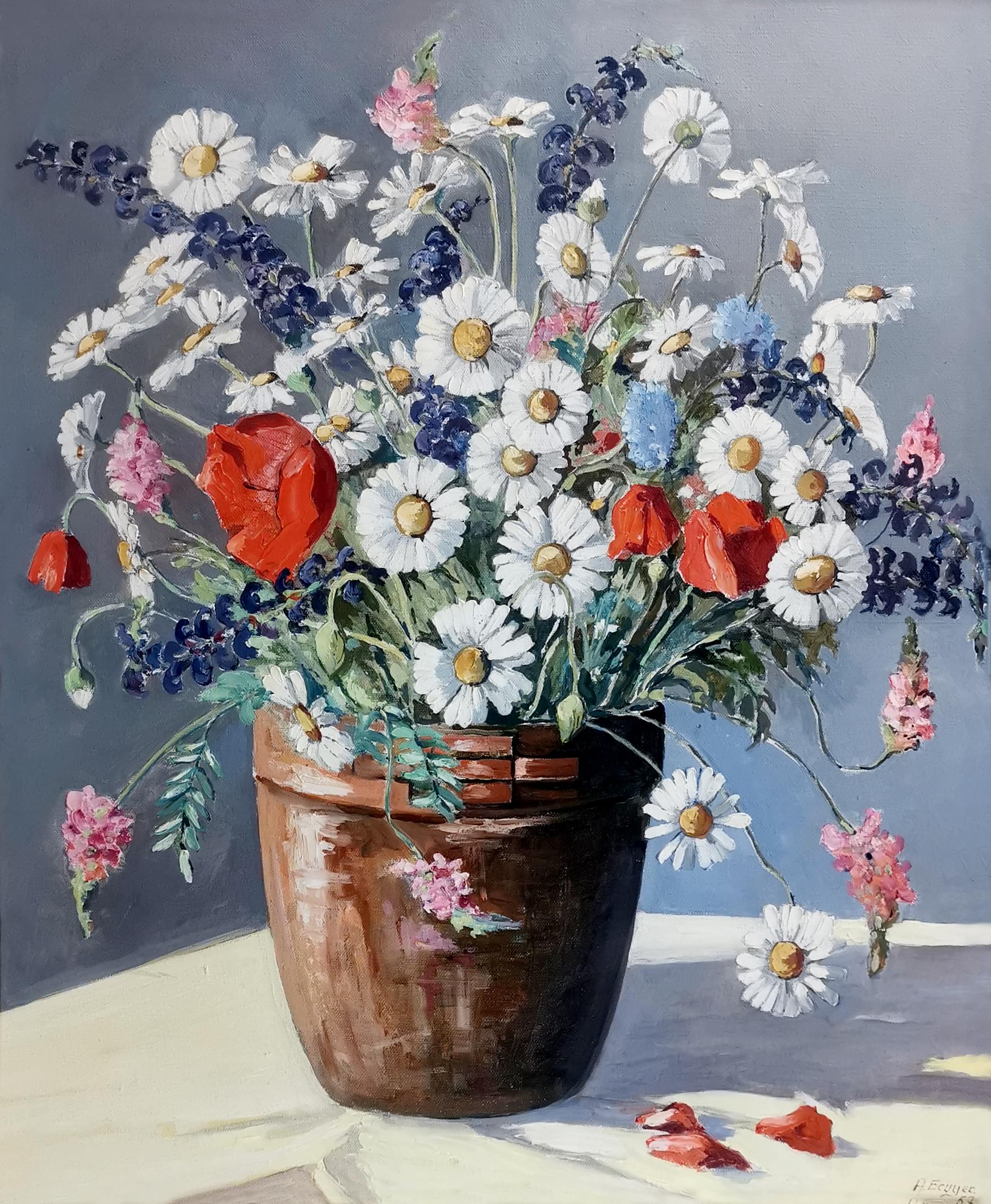 Vase fleurì, huile sur toile, signée et datée 57, 55x46 cm