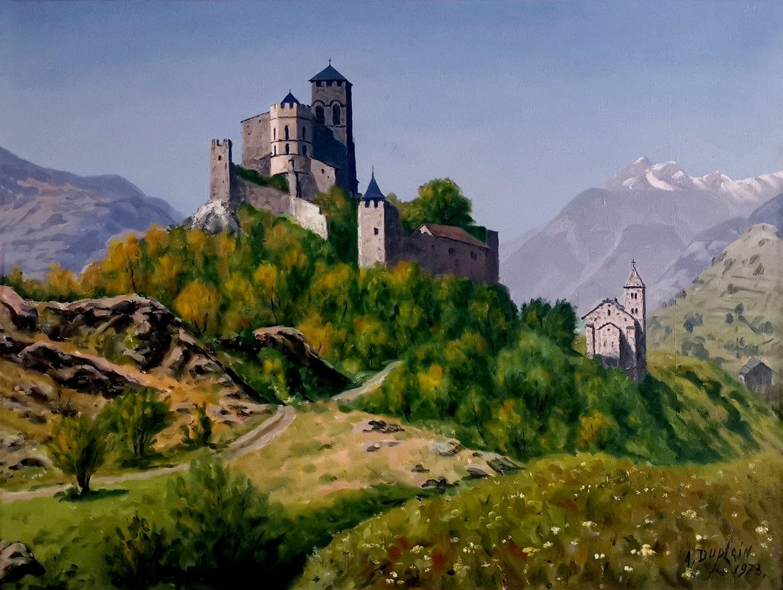 Basilique de Valère à Sion, huile sur toile, signée et datée 1973, 50x65 cm