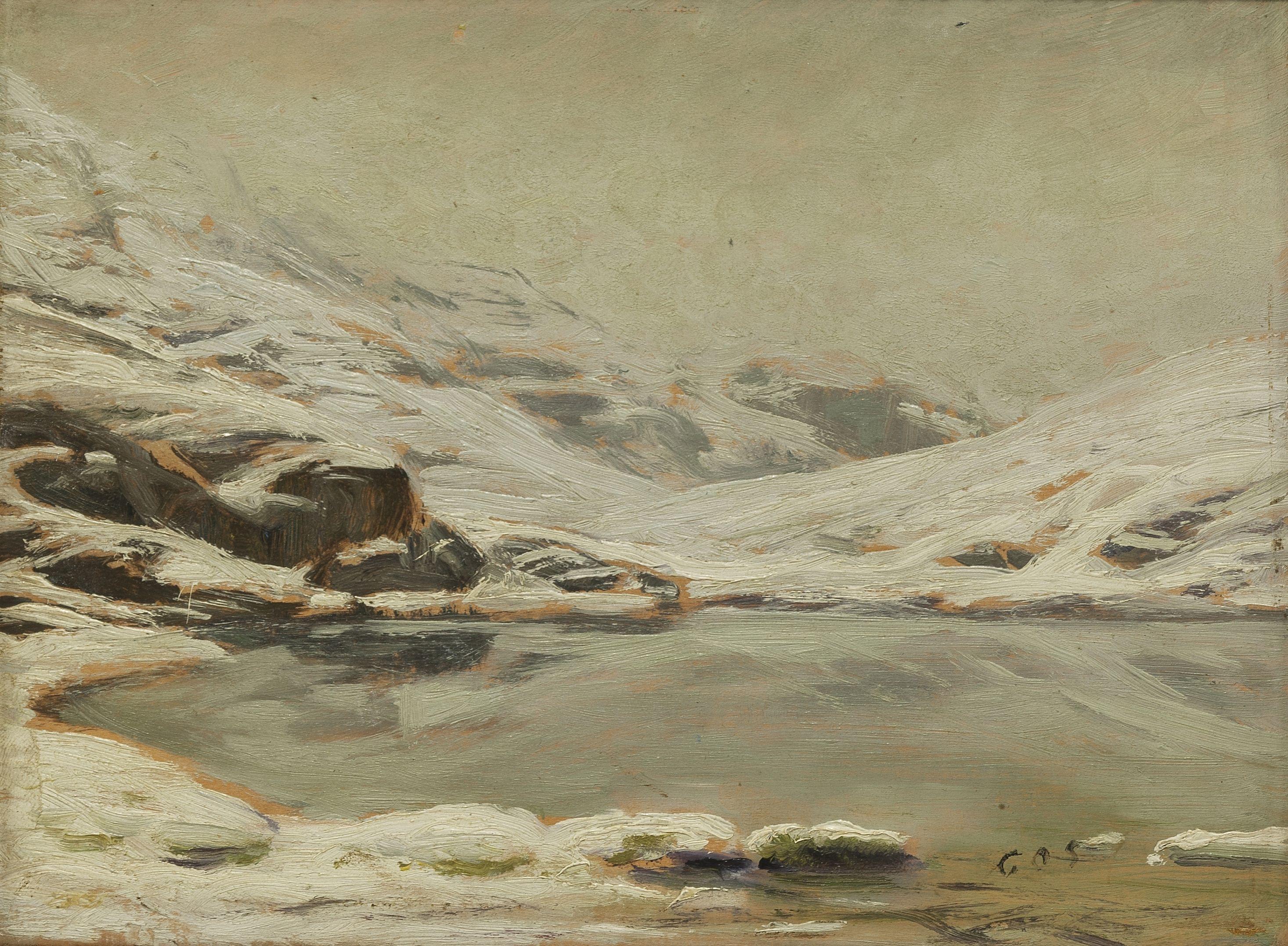 Lac de montagne en hiver, huile sur panneau, 17x23 cm