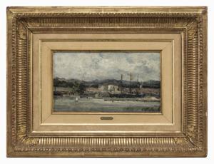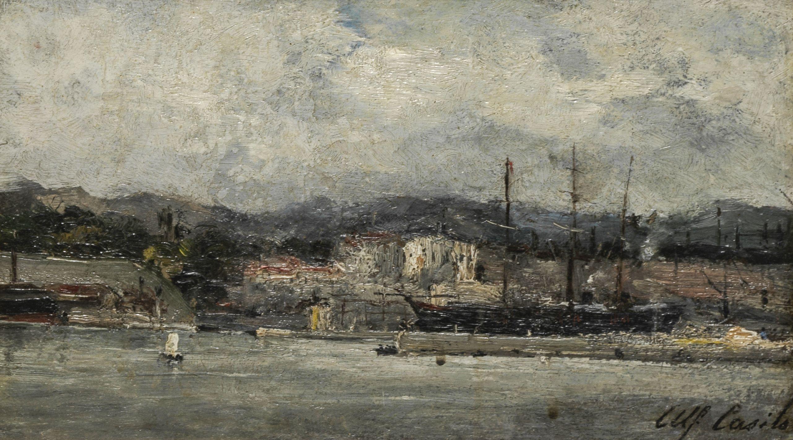 Scène portuaire, huile sur carton, signée, 16x27 cm