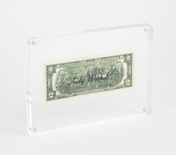 Two dollars, billet B21594746A, sous plexiglas, avec un certificat d'authenticité de la Galerie 32, année 1976, 6,5x15,5 cm