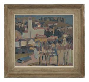 Vue sur l'église Saint-Pierre à Fribourg, huile sur toile, signée, 55x62 cm