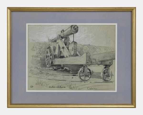 Canon à Calais, mine de plomb, signée, 23x30 cm