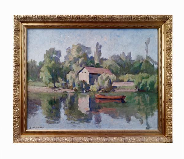 Barque sur le lac, huile sur toile, signée, 49x64 cm