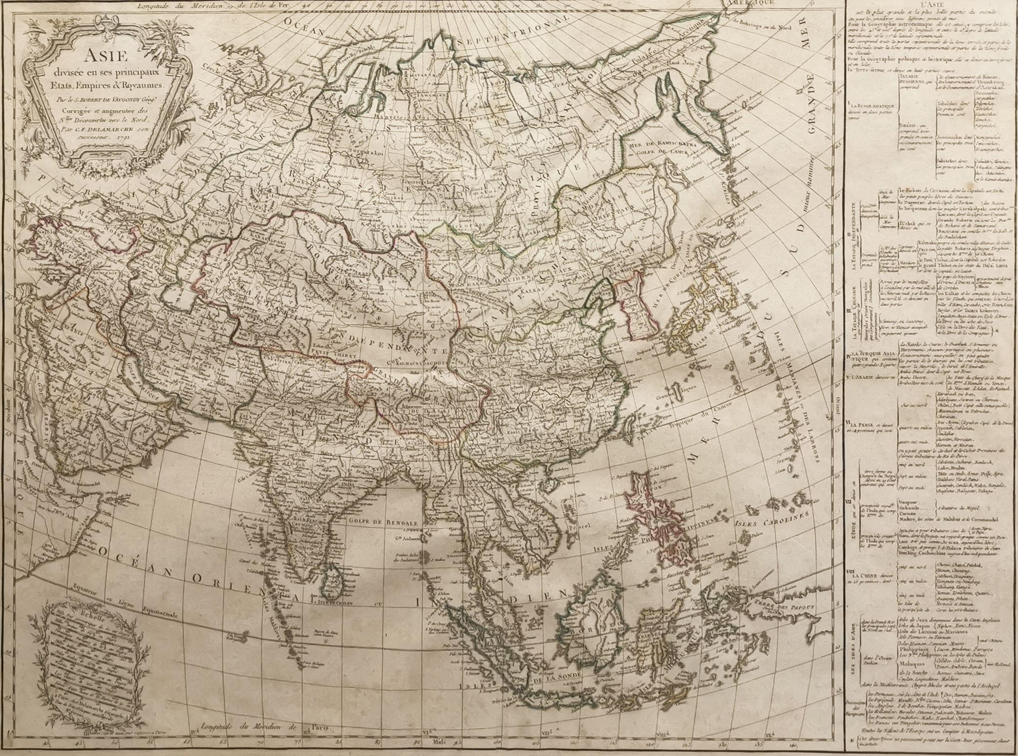 3957. Asie divisée en ses principaux Etats, Empires & Royaumes, par le S. Robert de Vaugondy géog., corrigée et augmentée des nlles découvertes vers le Nord par C.F. Delamarche son successeur, 1791, carte géographique, estampe, 52x74 cm. Lot vendu au profit de l'association Frères de nos Frères