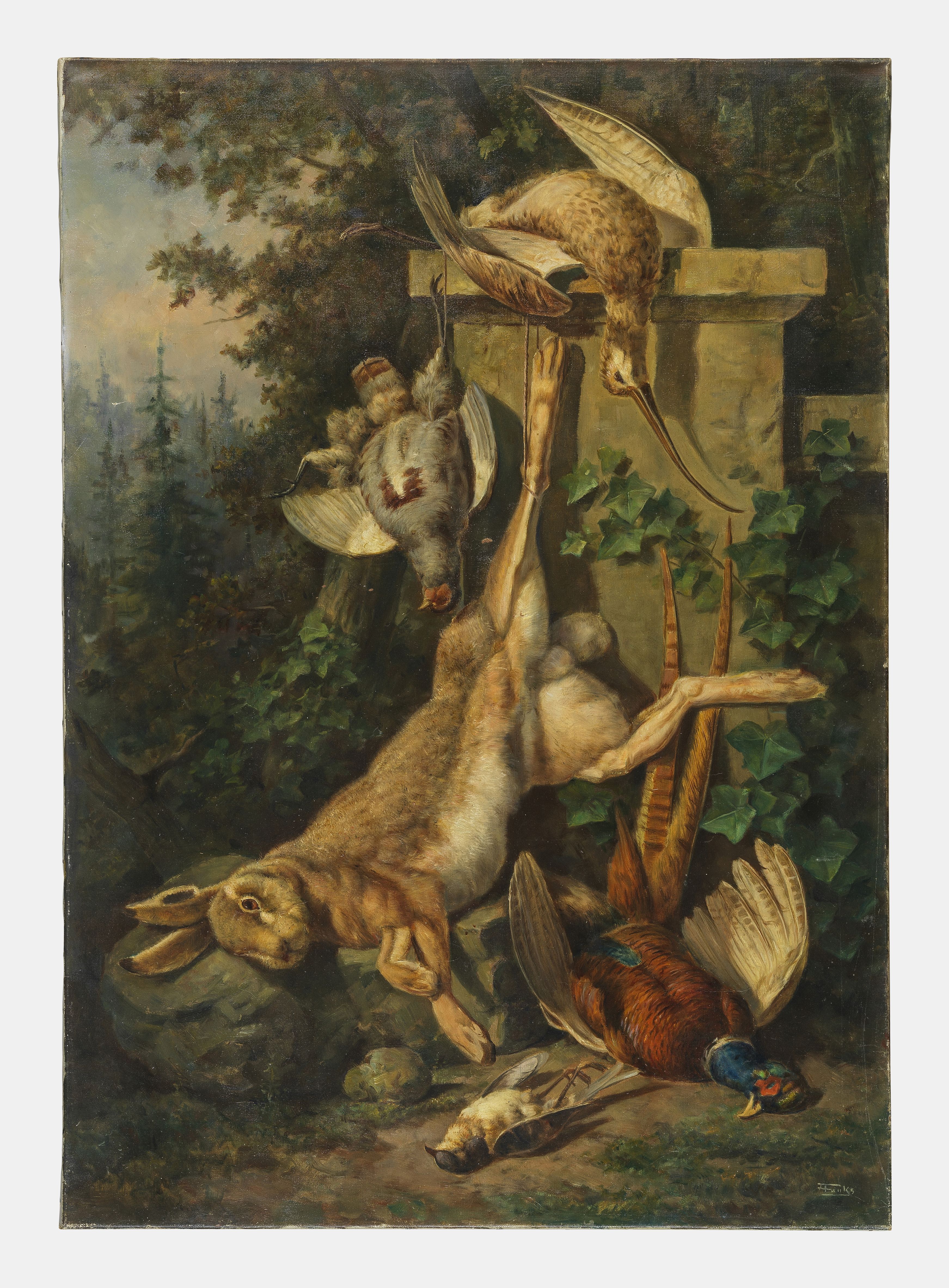 Nature morte au lièvre et oiseaux, huile sur toile, 78,5x112 cm