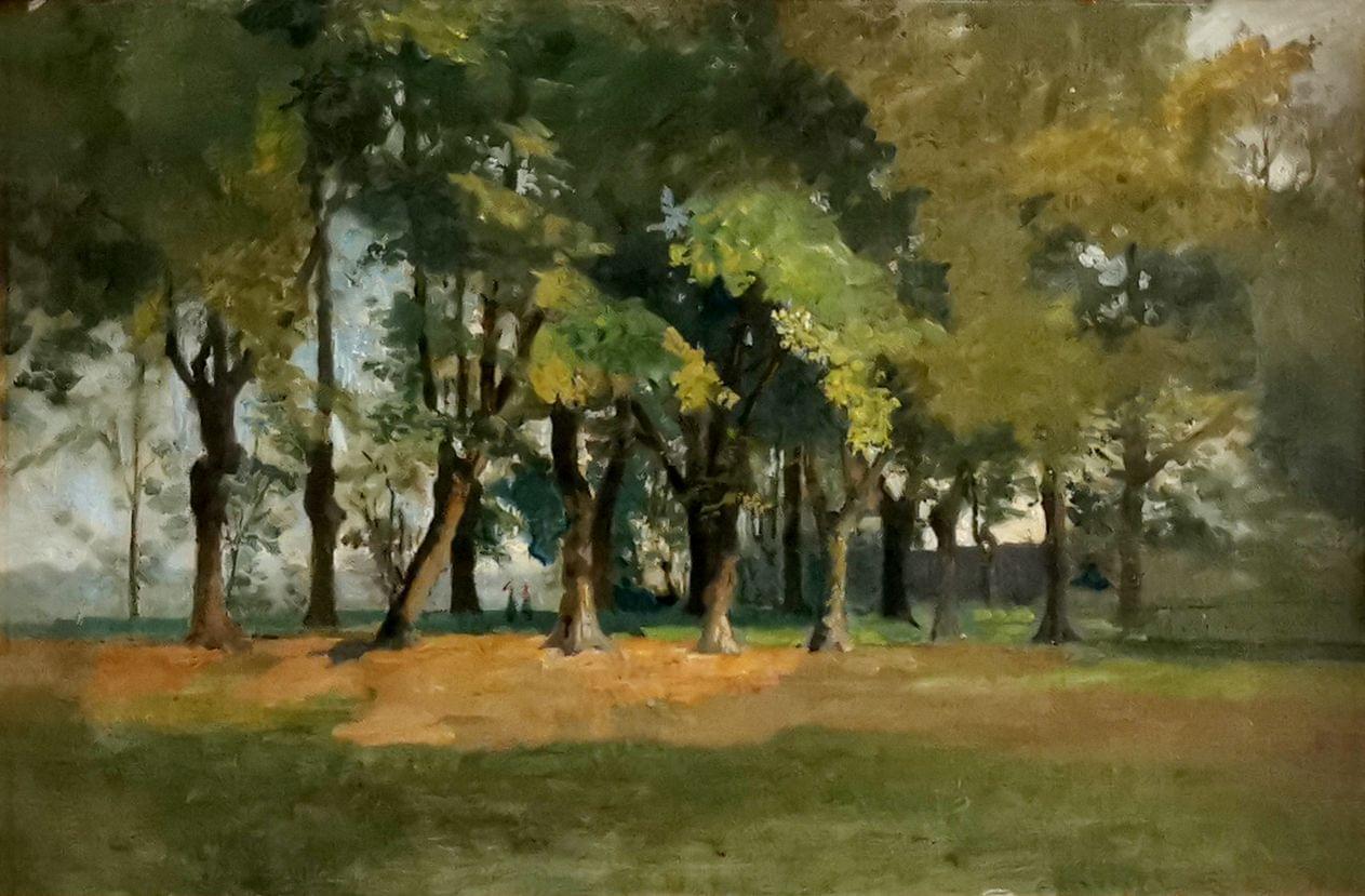 Promenade sous un bosquet d'arbres, huile sur carton, non signée, 27x36 cm