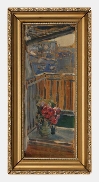 Balcon sur les toits de la ville, huile sur bois, 26x10 cm. Provenance: Famille de l'artiste