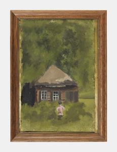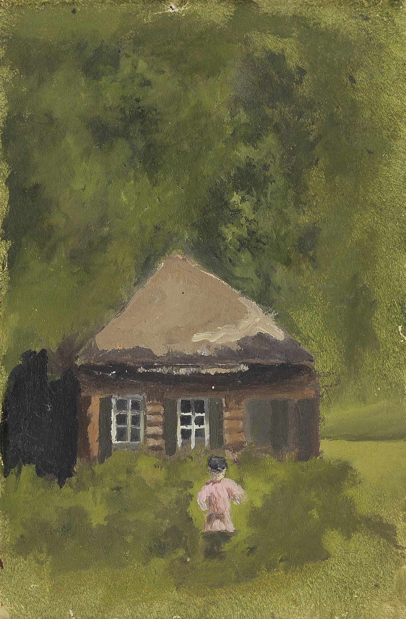 Jeune femme devant une datcha, huile sur carton, 27x11 cm.Provenance: Famille de l'artiste.