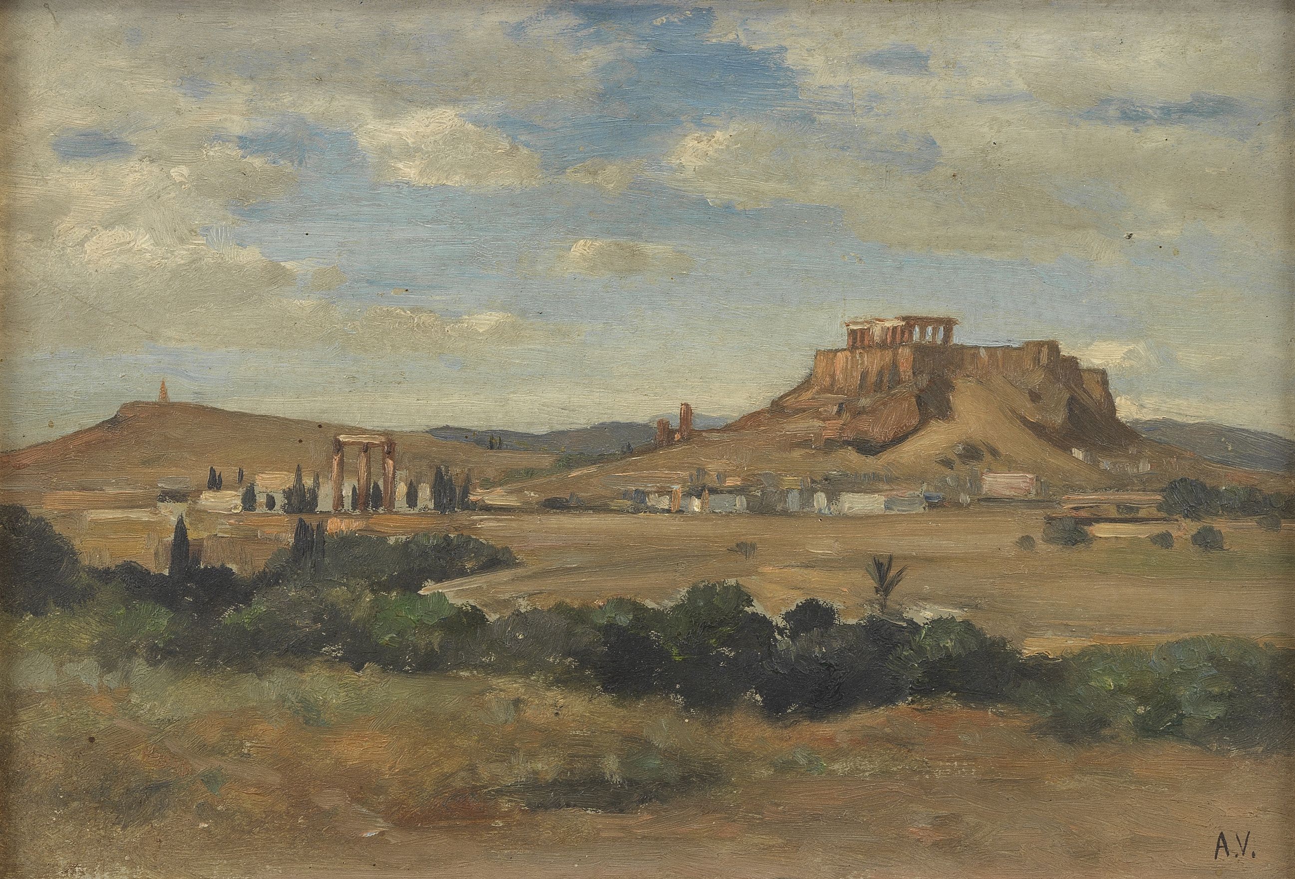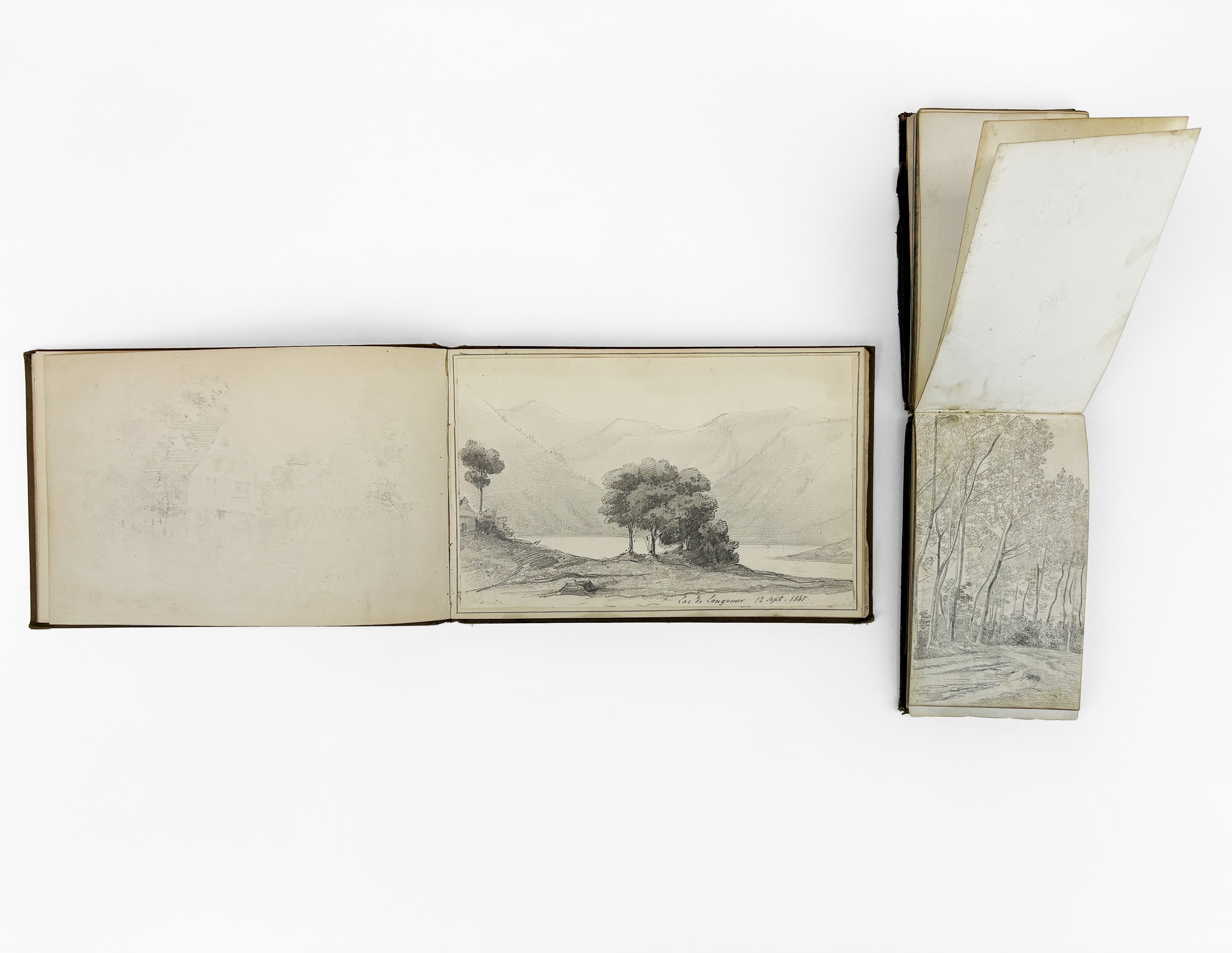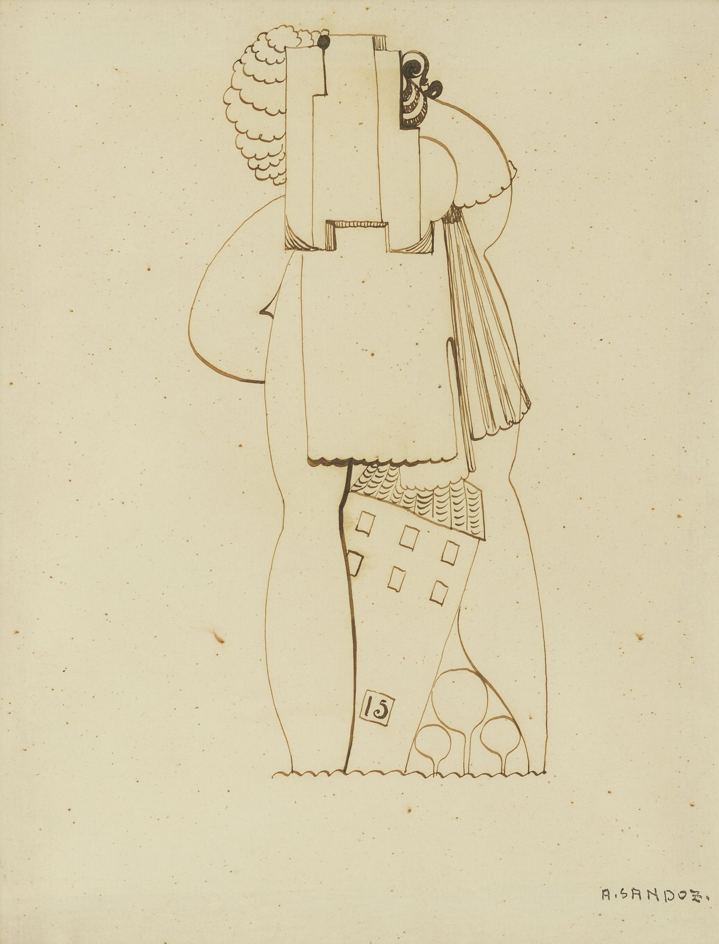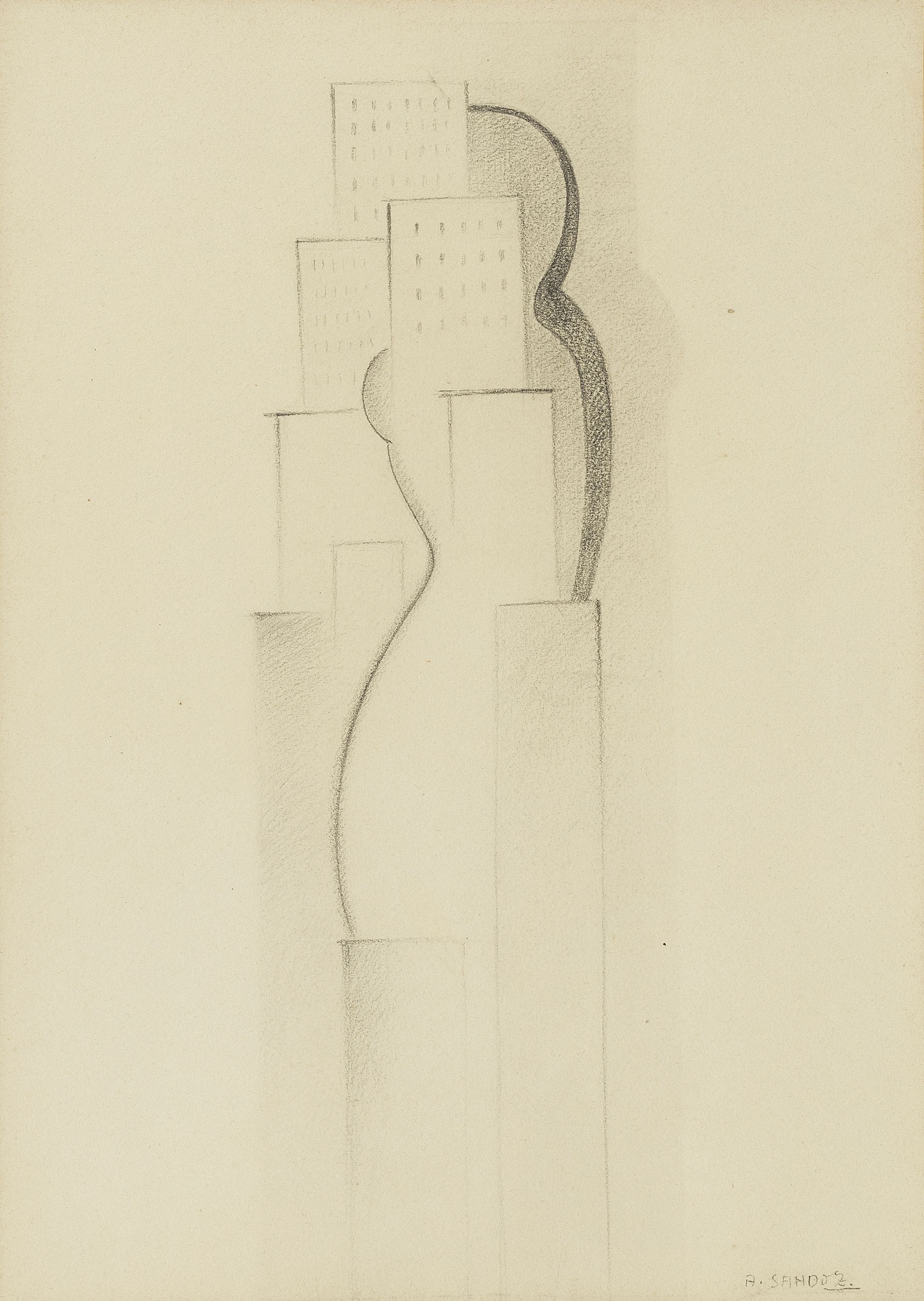 Composition à la maison penchée, encre et crayon sur papier, sig...
