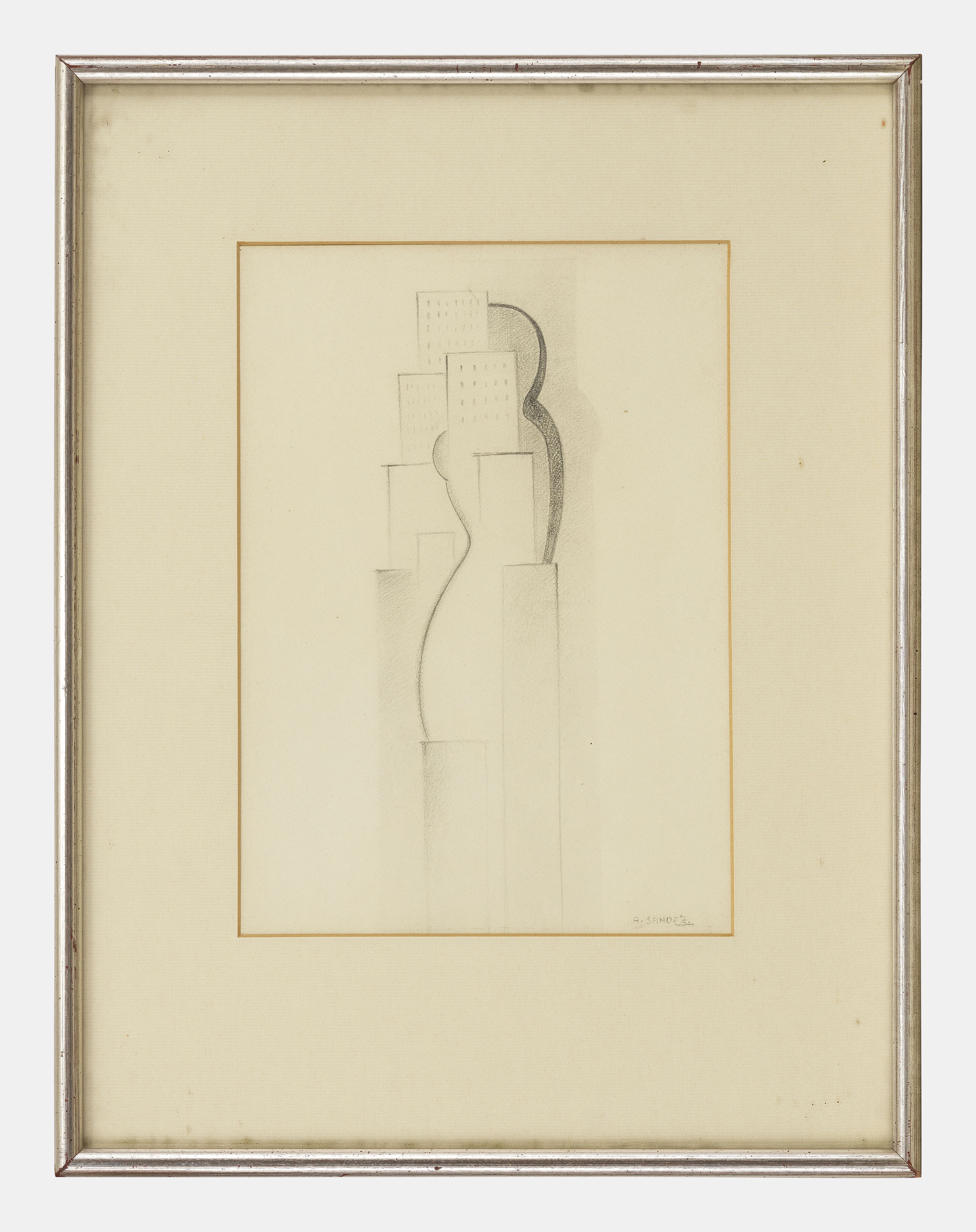 Composition à la maison penchée, encre et crayon sur papier, sig...