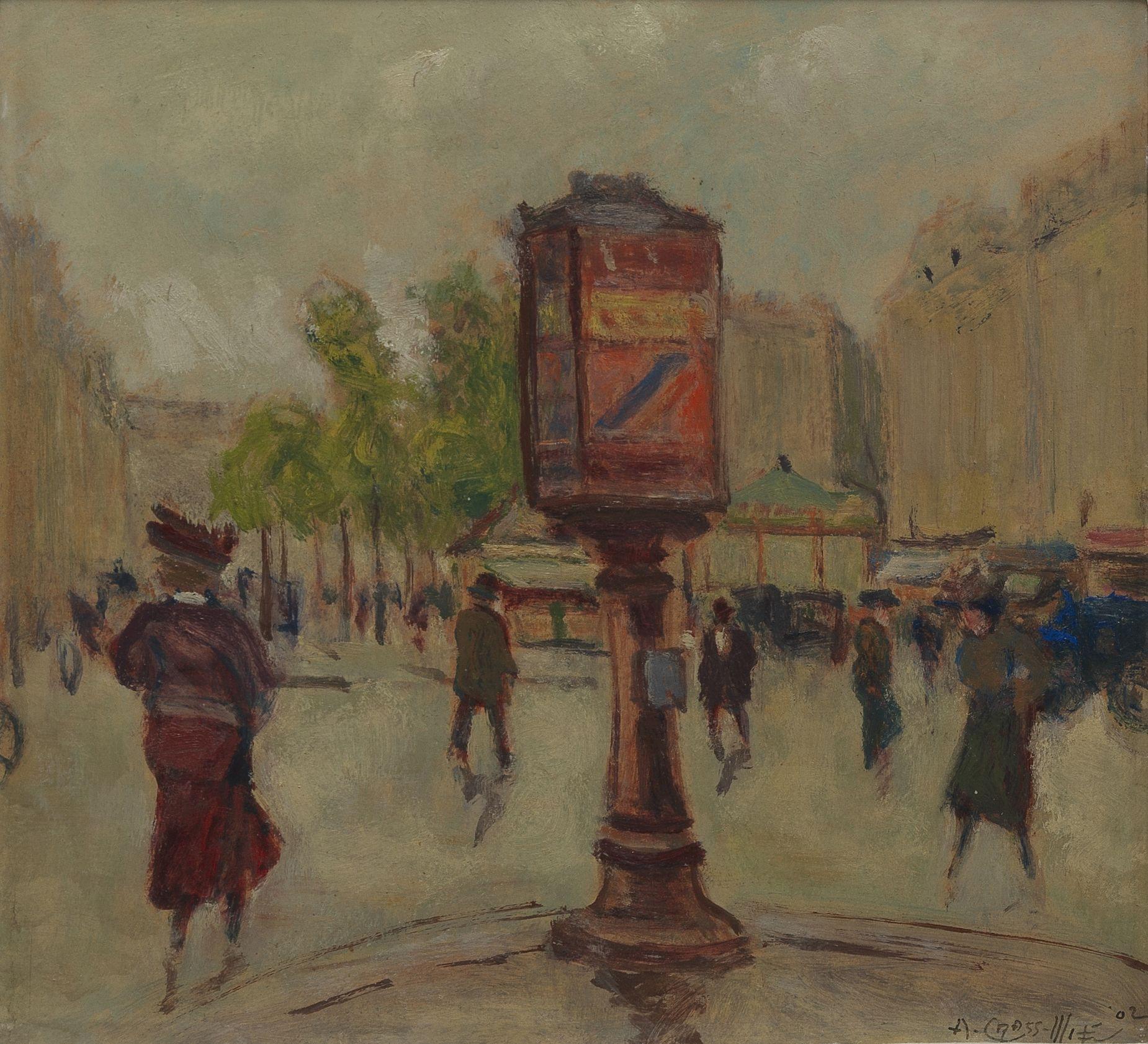 Colonne Morris, huile sur panneau, signée, 24x18 cm
