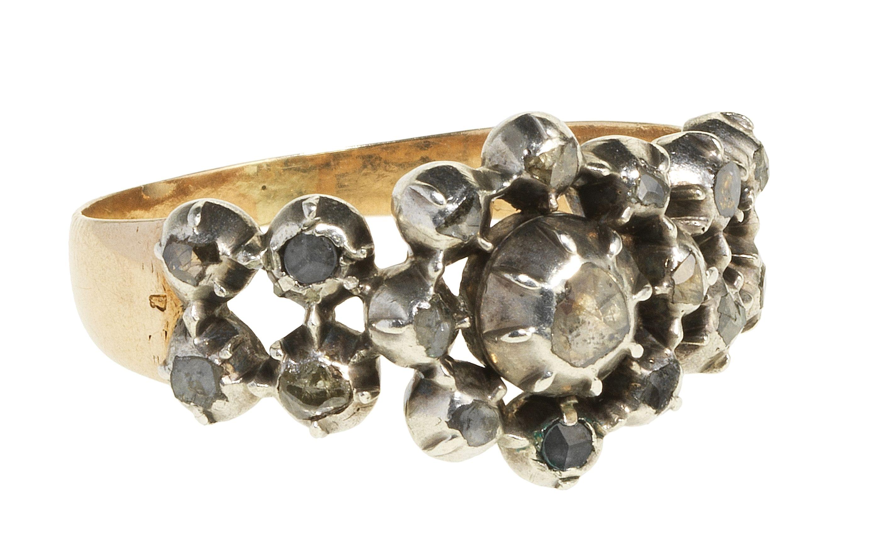 Travail ancien, probablement fin XVIIIe-début XIXe s, or et argent, doigt 67-27, poids brut 5 g. Pour les lots précédés d'un *, la TVA de 7,7% est due sur l'entier du prix d'adjudication.
