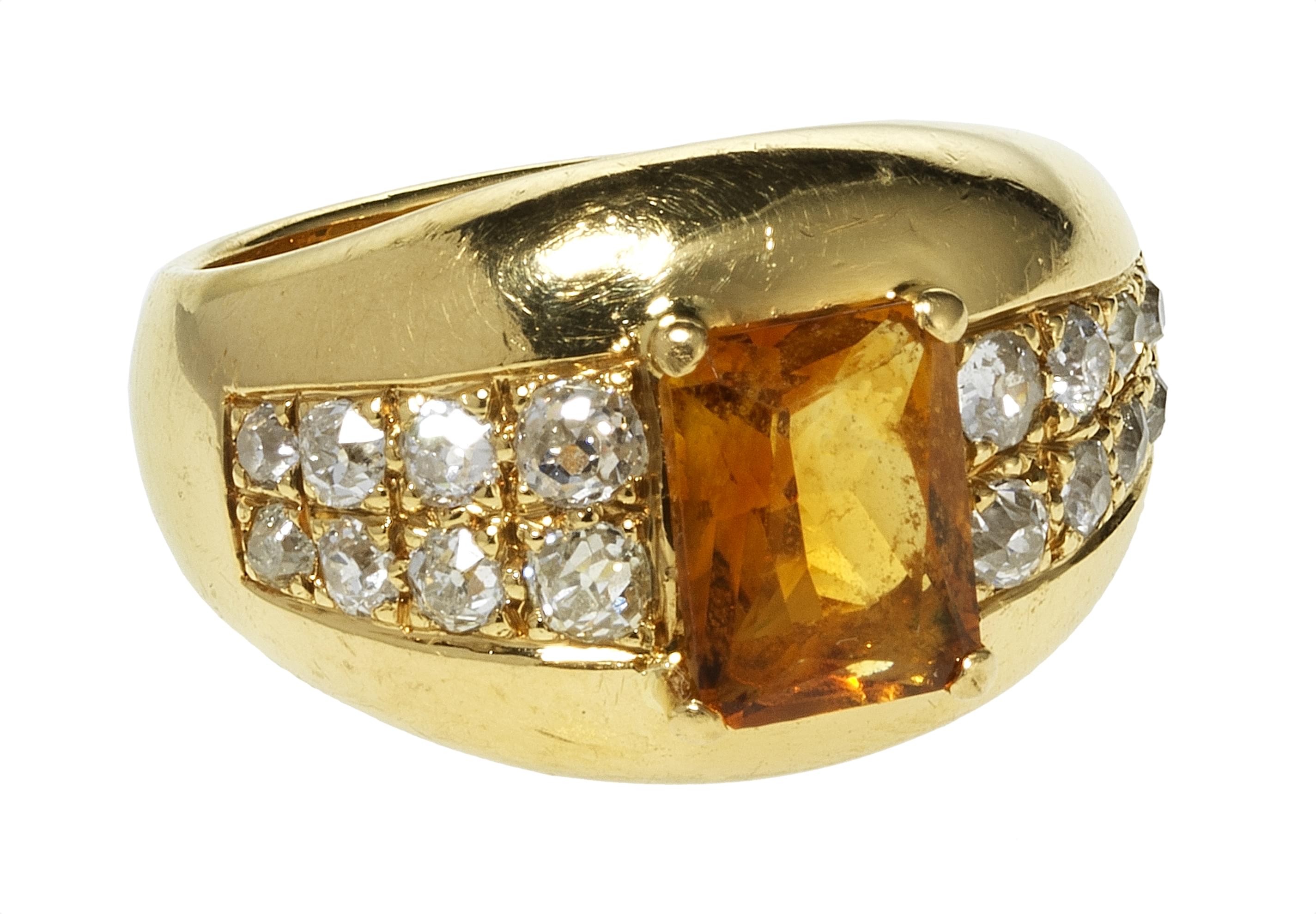 3379. Bague bandeau sertie d'une citrine taille rectangle épaulée de pavages de diamants taille ancienne