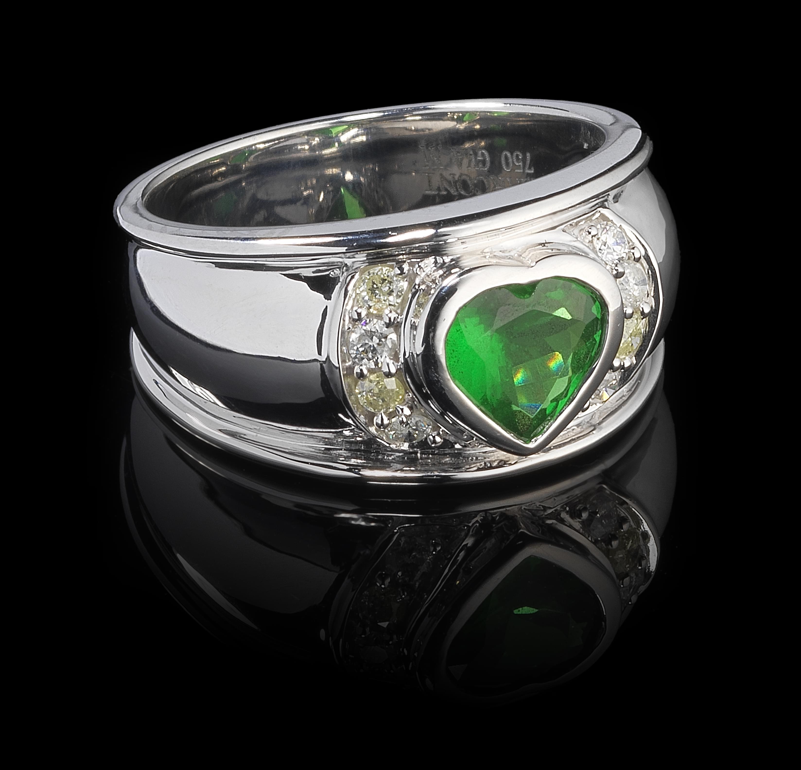 3312. Bague bandeau sertie d'une tsavorite taille coeur (env. 0,7 ct) épaulée de diamants (env. 0,15 ct)