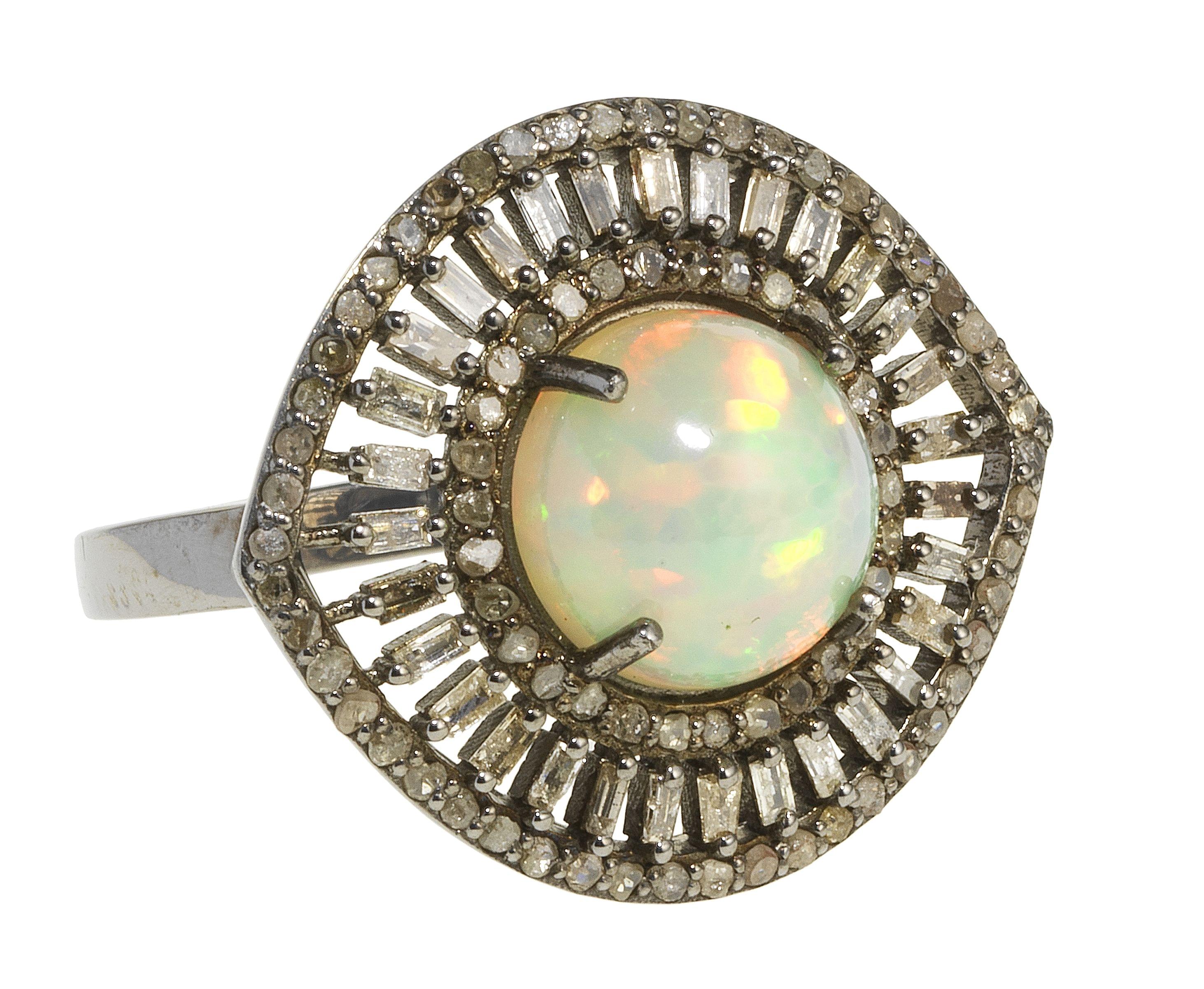 3152. *Bague centrée d'une opale à fond blanc taille cabochon (env. 2,5 ct)