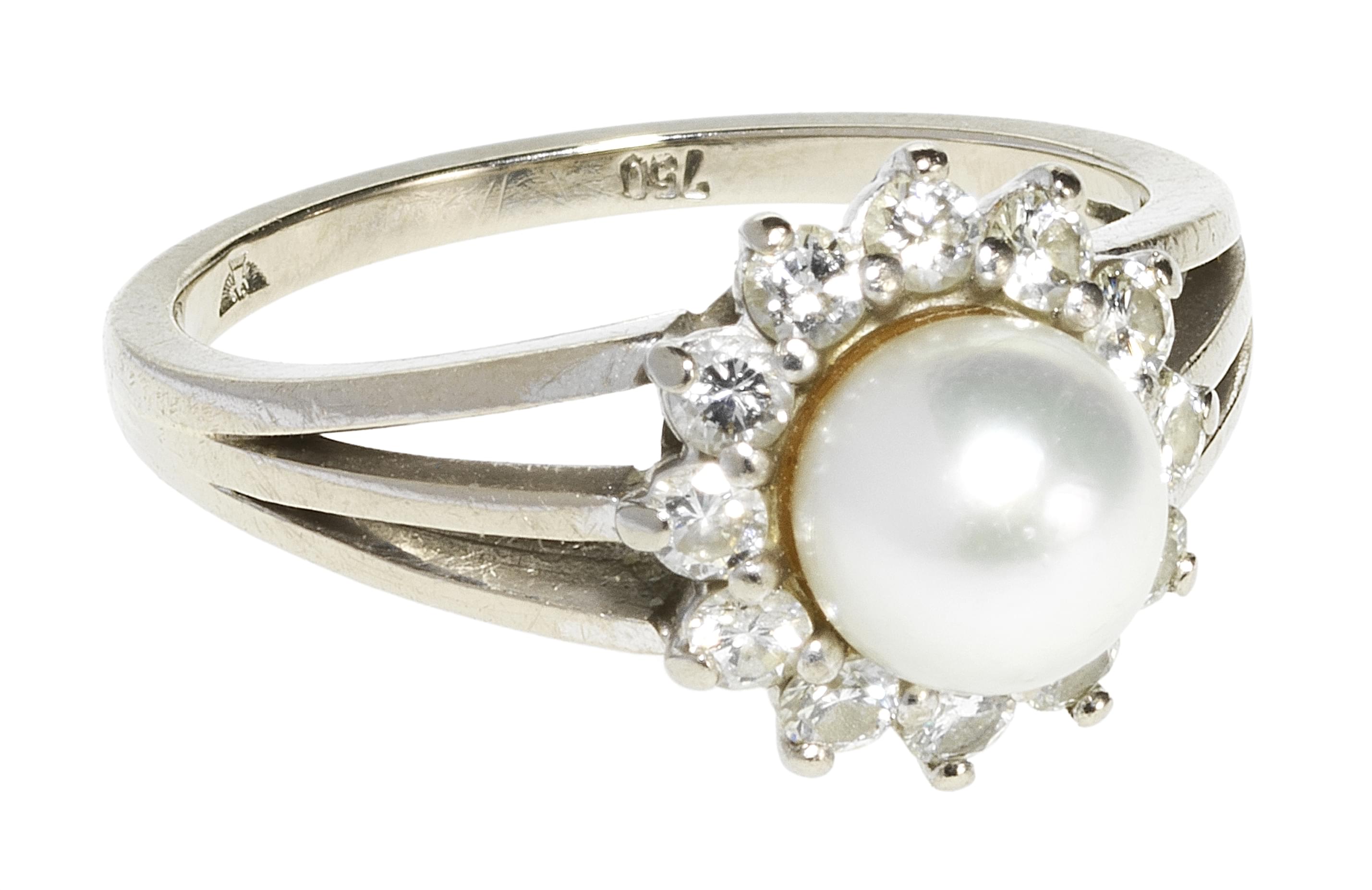 3292. Bague centrée d'une perle (D env. 6 mm) entourée de diamants (env. 0,35 ct)
