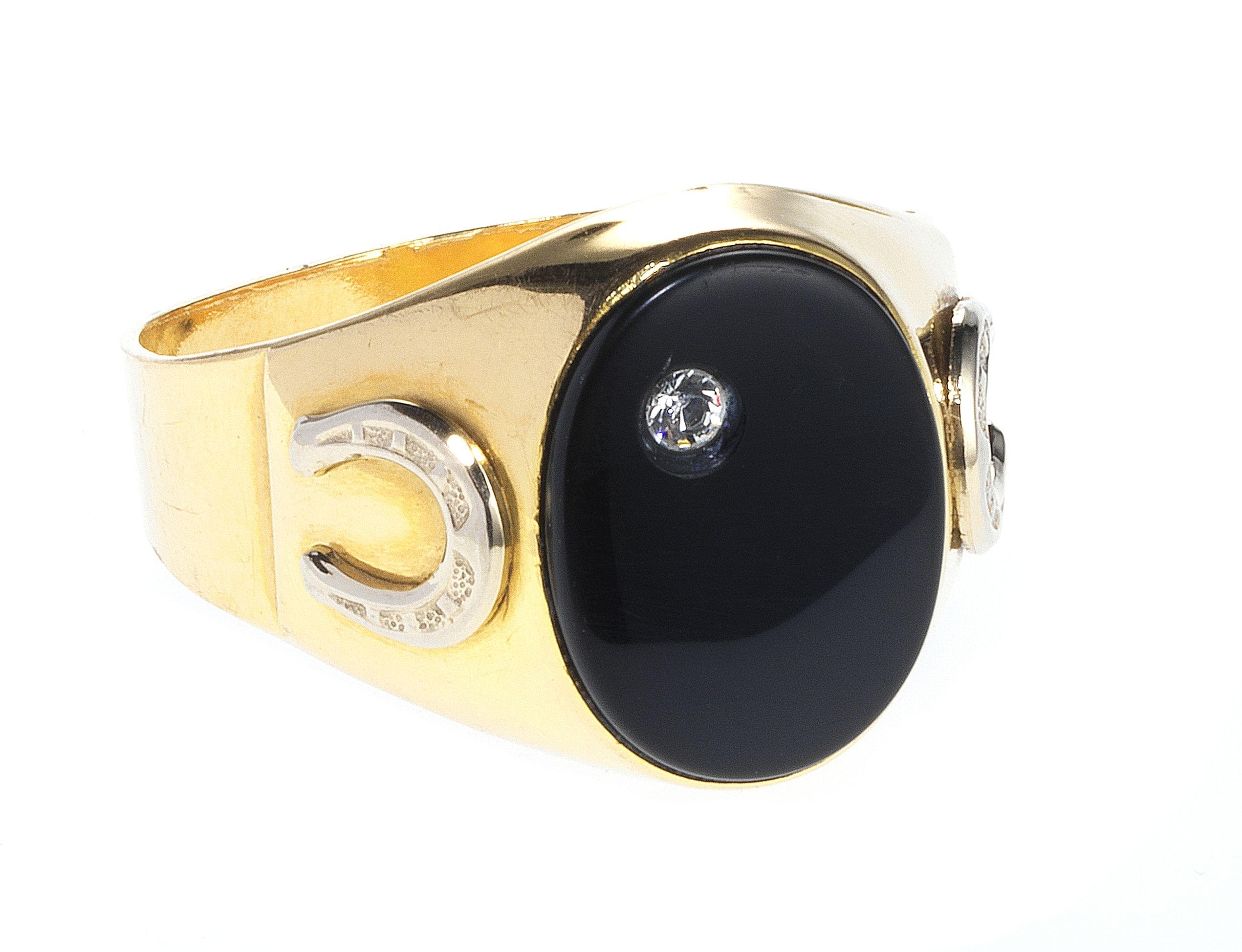 3173. Bague-chevalière centrée d'une plaque d'onyx ovale sertie d'un petit diamant, sur une monture à motifs de fers à cheval