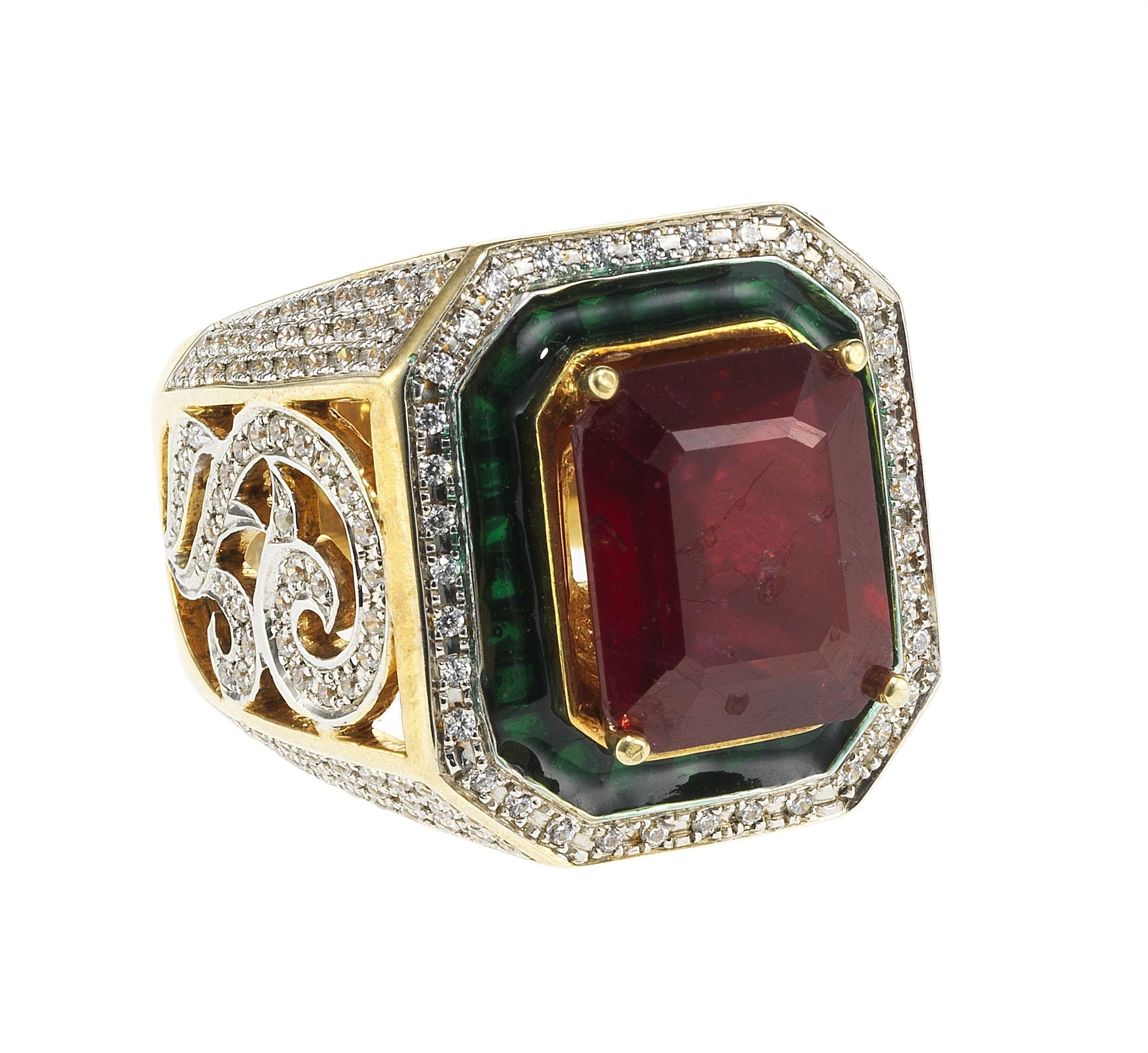 Entouré d'émail vert, sur une monture ajourée à décor végétal pavé de pierres d'imitation pour le diamant, vermeil 925, doigt 58-18. Pour les lots précédés d'un *, la TVA de 7,7% est due sur l'entier du prix d'adjudication.