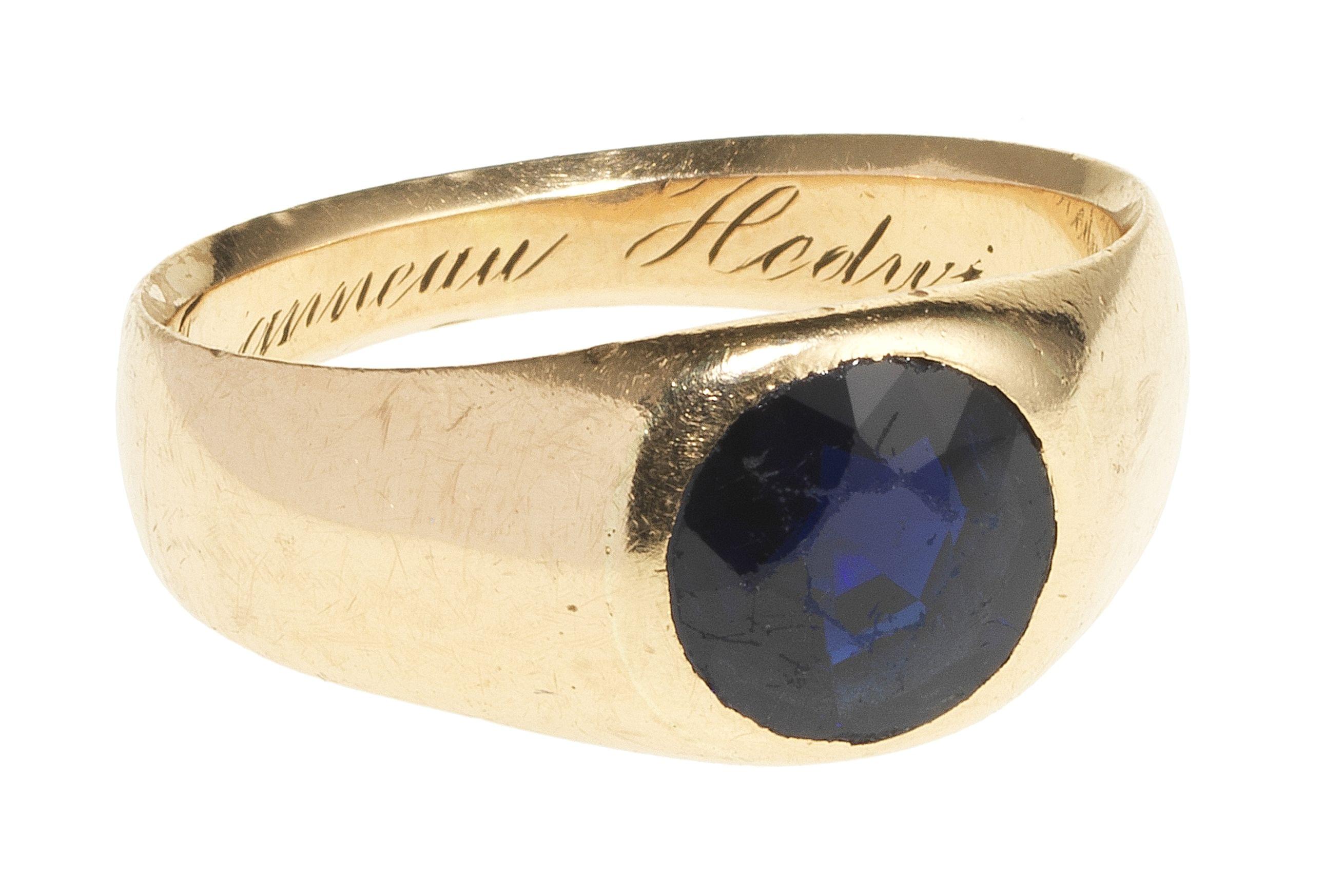 3146. Bague chevalière sertie d'un saphir synthétique taille brillant fantaisie