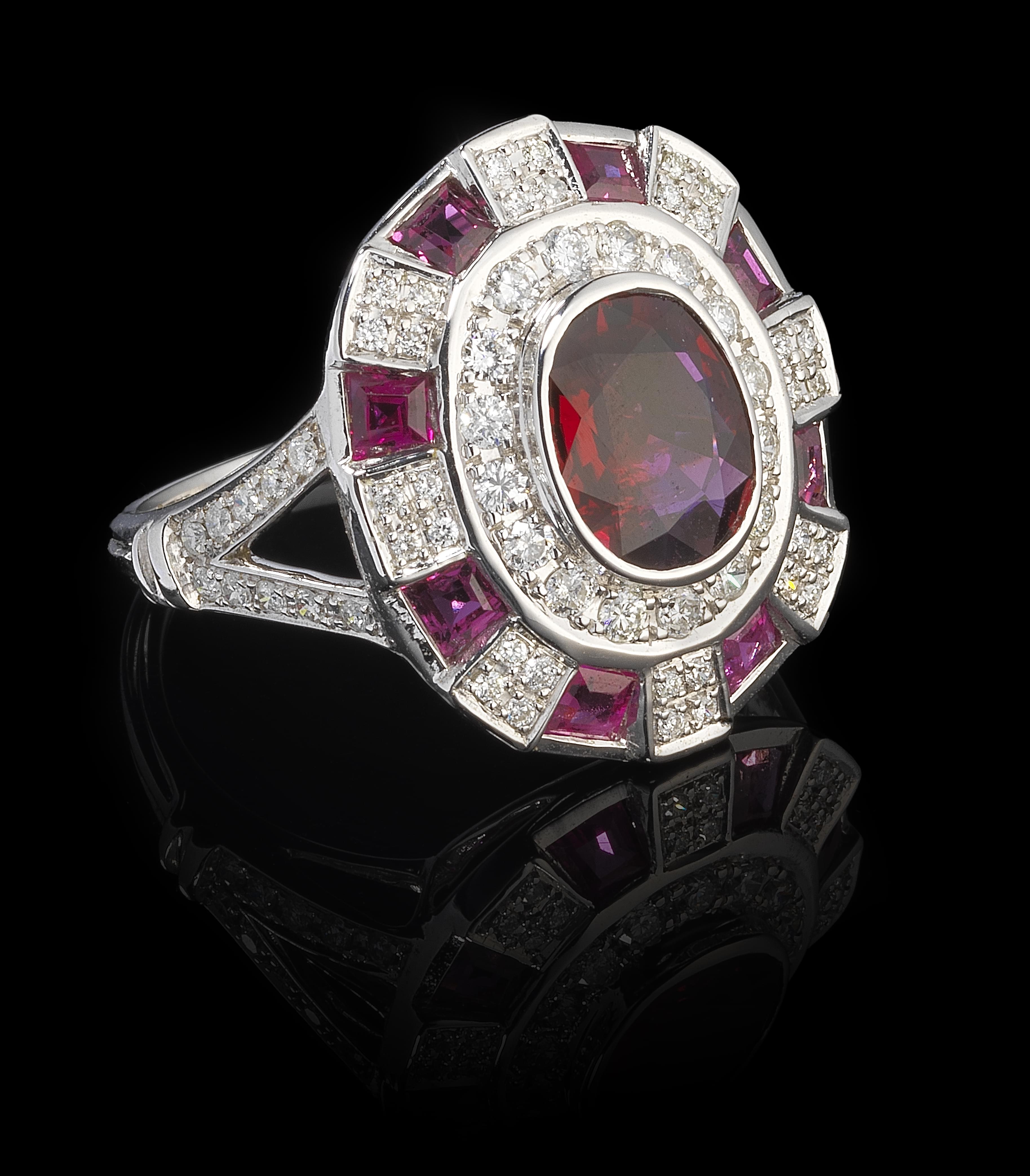 Centrée d'un rubis taille ovale (1,35 ct) dans un double entourage de diamants (0,44 ct) et de rubis calibrés, or gris 750, doigt 53-13, 4 g, accompagnée d'un certificat GFCO. Pour les lots précédés d'un *, la TVA de 7,7% est due sur l'entier du prix d'adjudication.