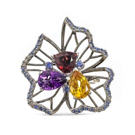 148. Bague fleur sertie d’un cœur de grenat, citrine et améthyste entouré de saphirs et diamants