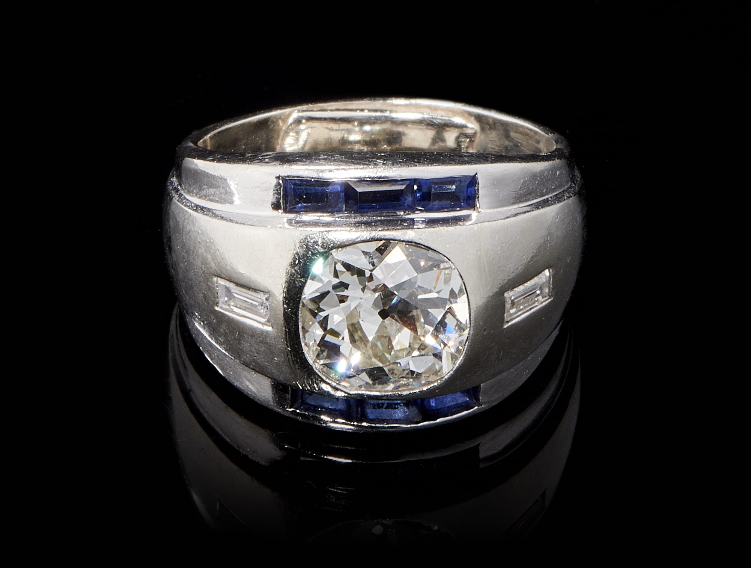 717. Bague jonc sertie d'un diamant taille ancienne (env. 1,8 ct) épaulé de deux diamants baguette et de saphirs taille baguette