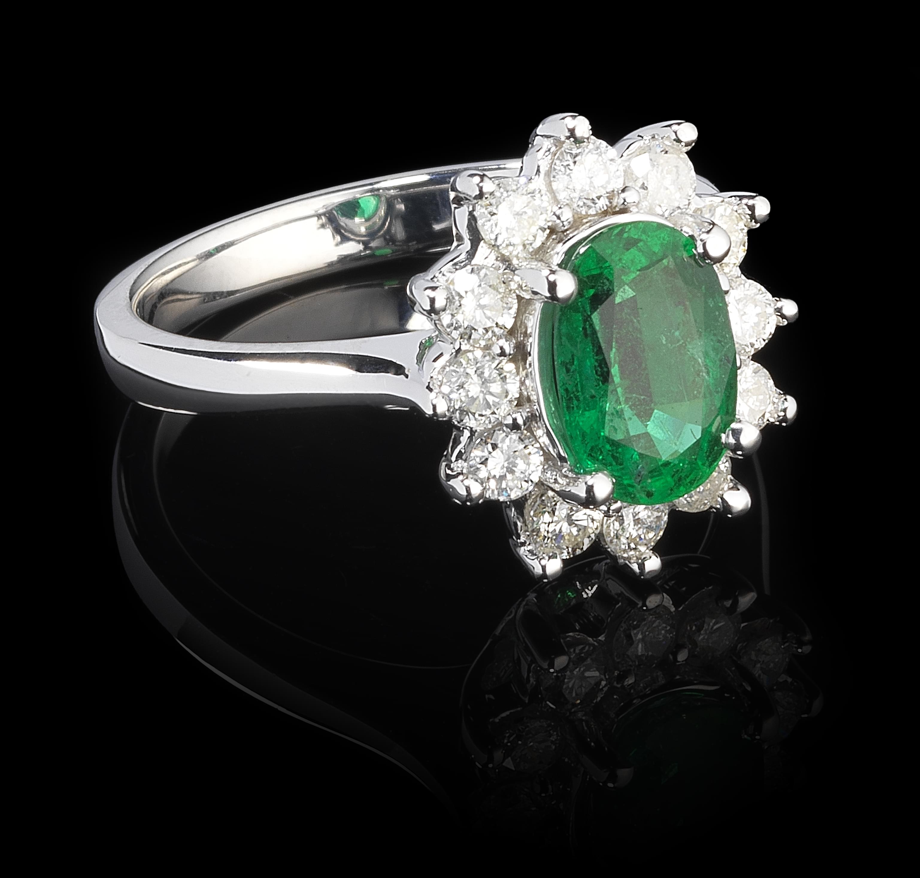 3409. Bague marguerite centrée d'une émeraude taille ovale (env. 1 ct)