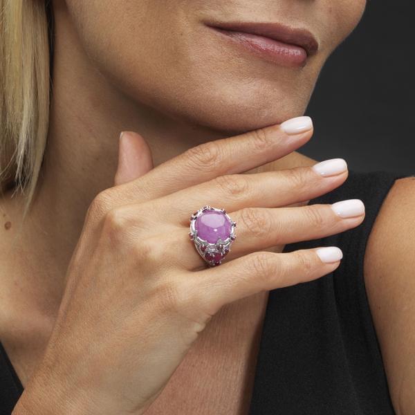 Sur une monture ajourée, pavée de rubis taille poire et brillant (total 1,87 ct) et de diamants (0,97 ct), or gris 750, doigt 53-13, 14 g, accompagnée d'un certificat GFCO. Pour les lots précédés d'un *, la TVA de 7,7% est due sur l'entier du prix d'adjudication.
