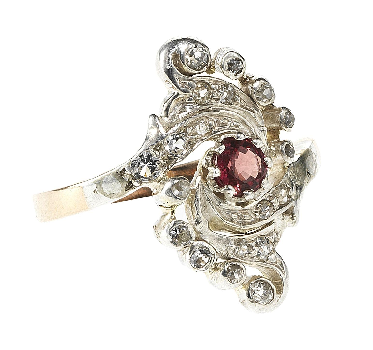 3135. Bague sertie d'un rubis rouge-orangé sur un motif pavé de diamant taille rose et 8/8