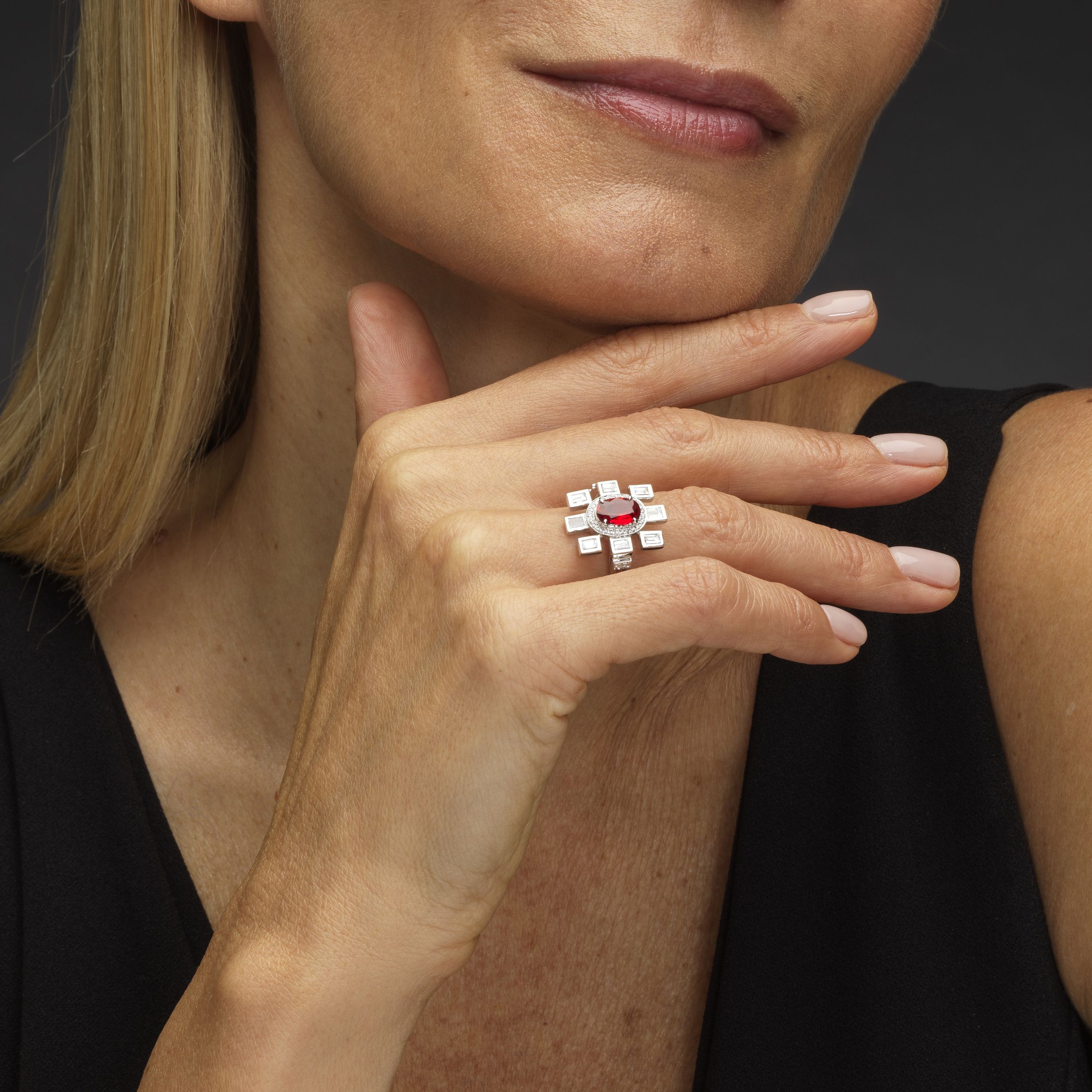 4503. *Bague sertie d'un rubis taille ovale (env. 0,9 ct) entouré de diamants (env. 0,6 ct)