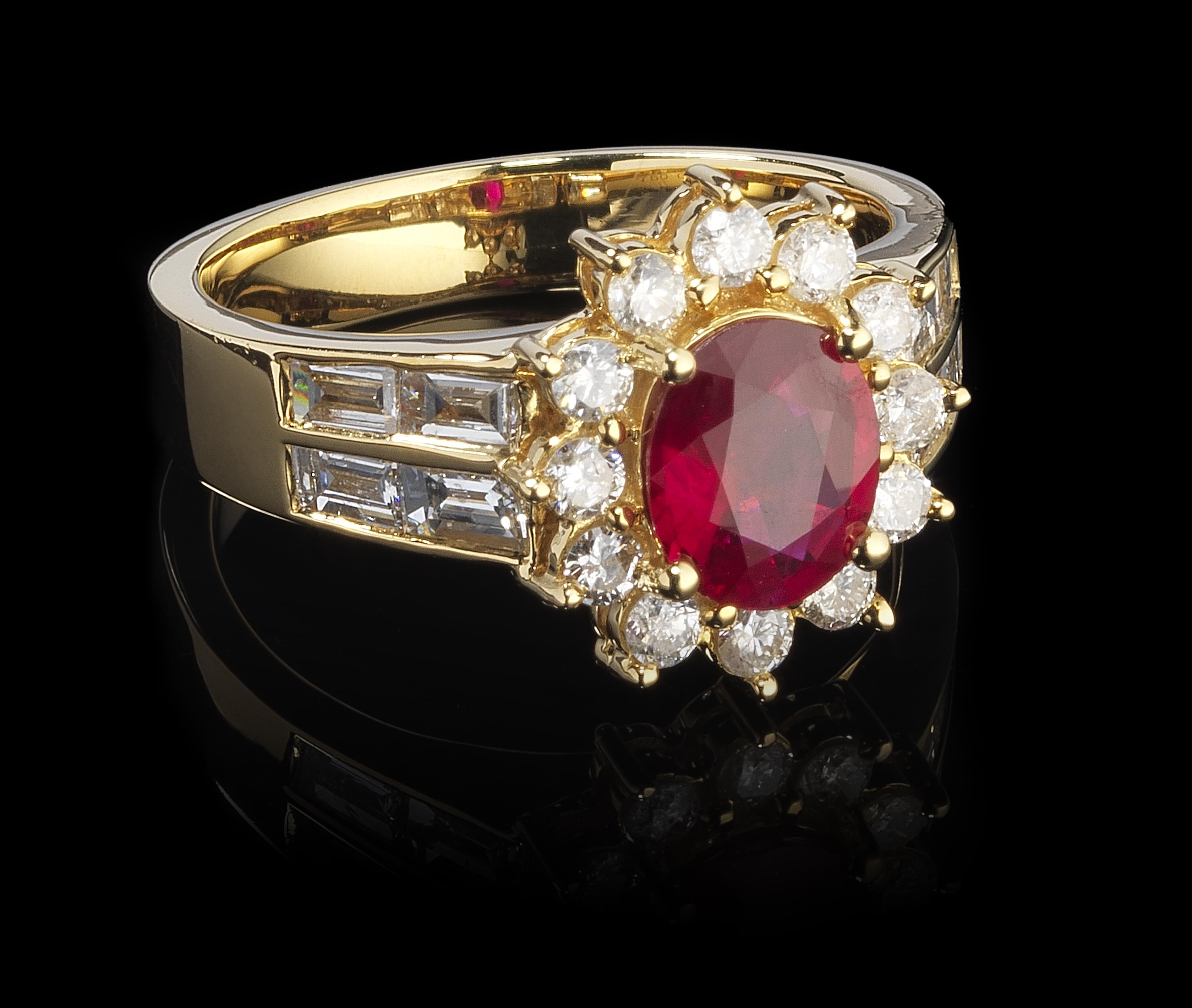 106. Bague sertie d'un rubis taille ovale (env. 1 ct) entouré de diamants et épaulé de diamants taille baguette (total env. 0,9 ct)