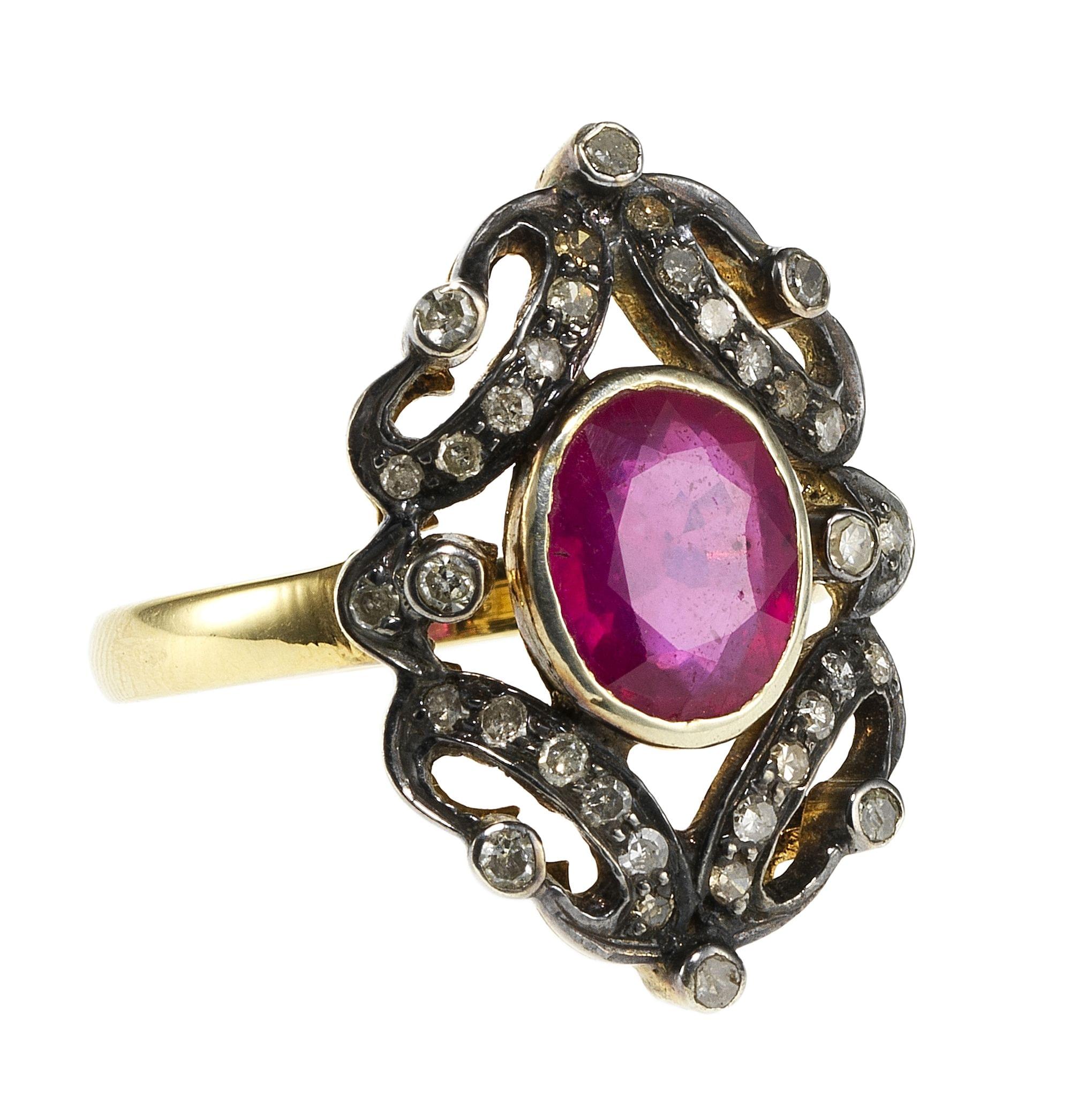 3190. *Bague sertie d'un rubis taille ovale (env. 1,8 ct) sur une monture ajourée sertie de diamants